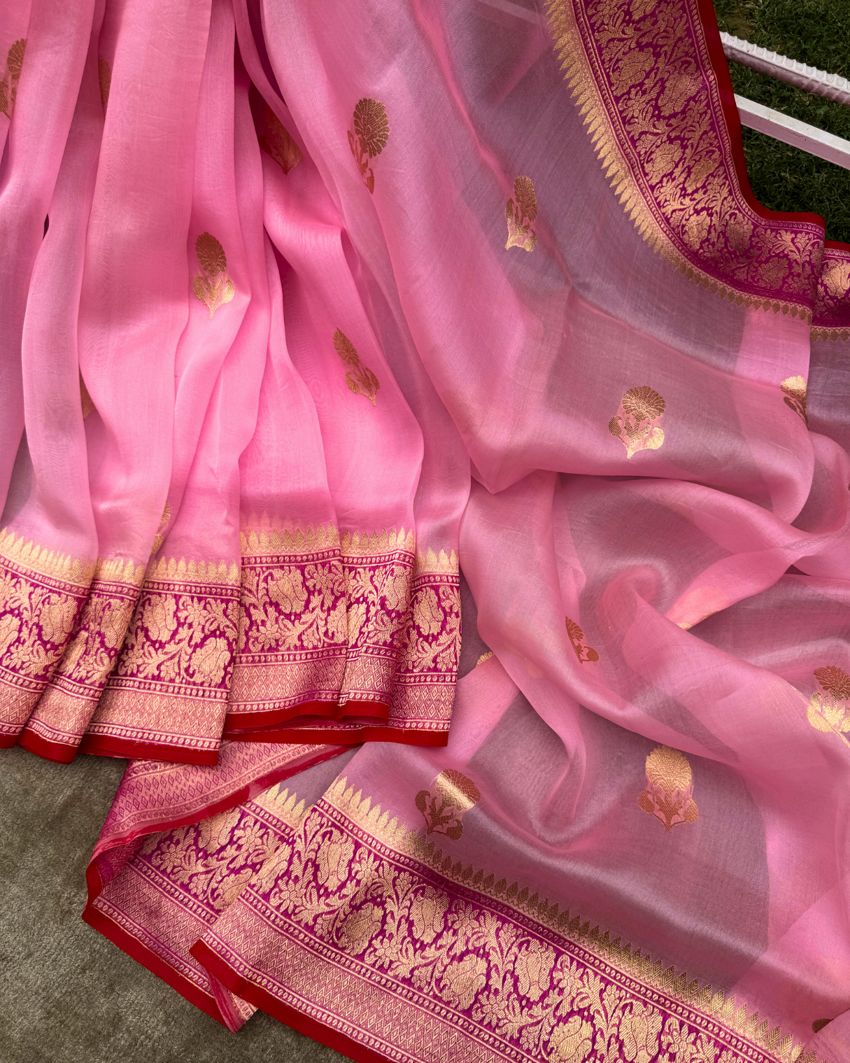 A vibrant pink drape enhanced with delicate golden floral bootas and a bold red contrasting border designed with a rich floral zari pattern running across.