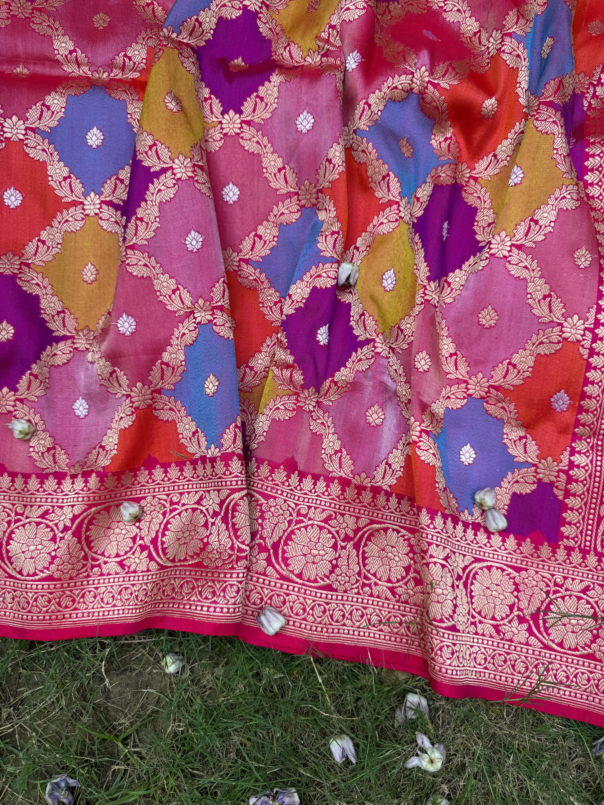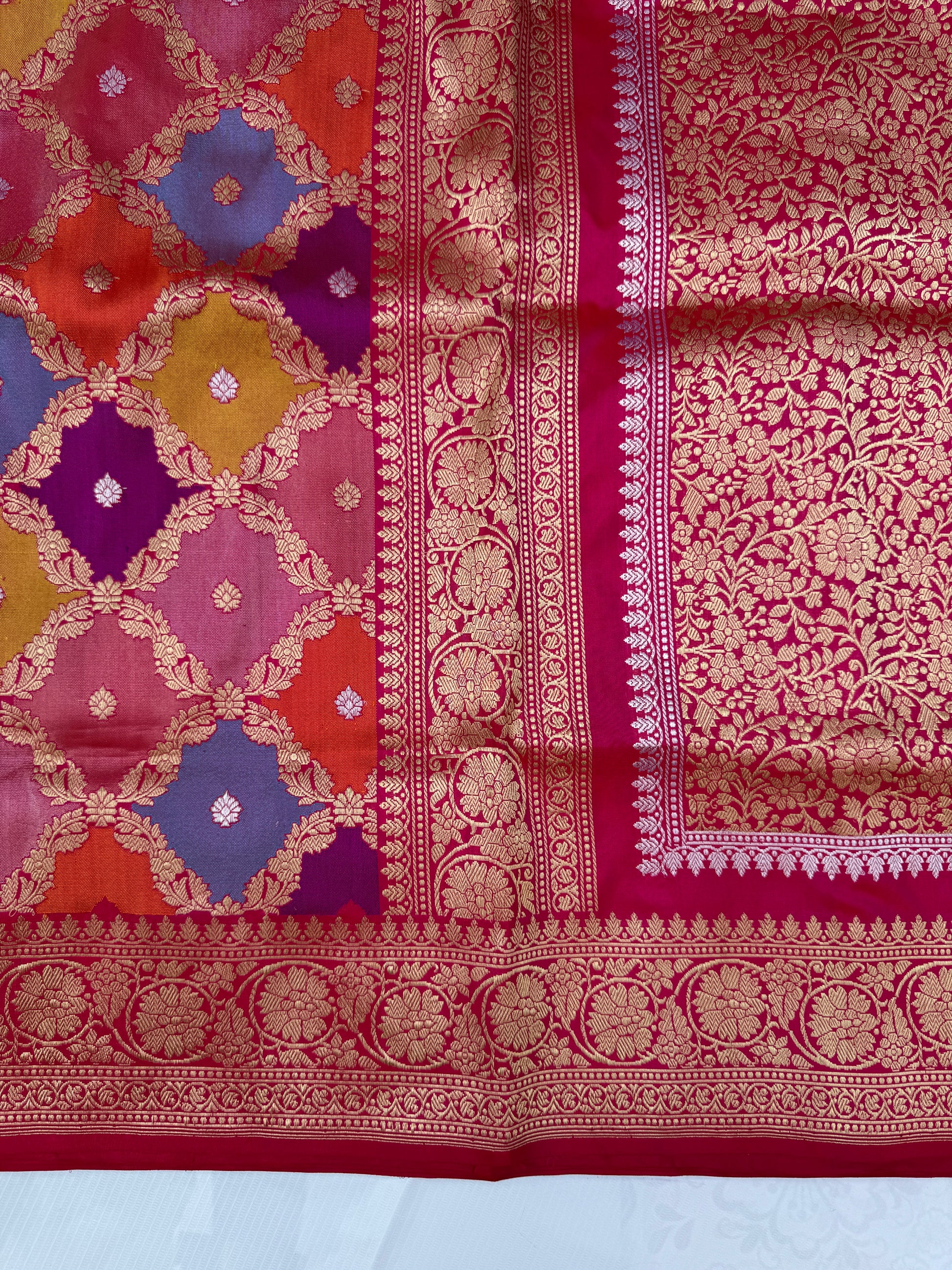 Woven in the revered Kadwa technique, each motif is crafted individually by skilled Banarasi artisansâresulting in unmatched detailing, superior durability, and a richness that only true handloom can offer. The luminous silk body paired with intricate zari work creates a fiery yet graceful aura that commands attention.