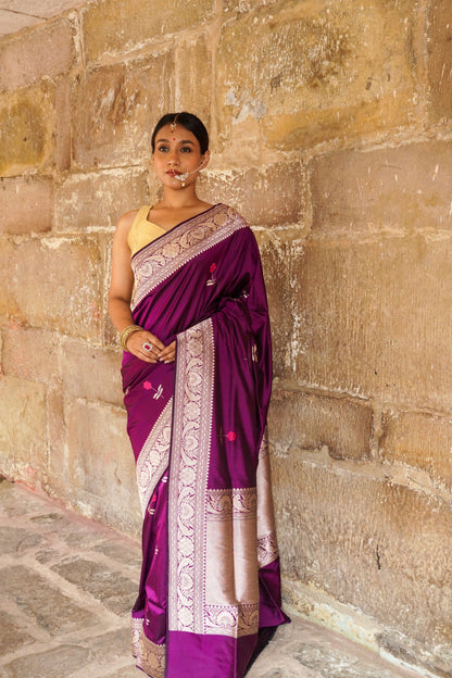 The epitome of timeless beauty, this handcrafted Deep Wine Banarasi Alfi saree is adorned with intricate flower zari booties, showcasing unparalleled brilliance.