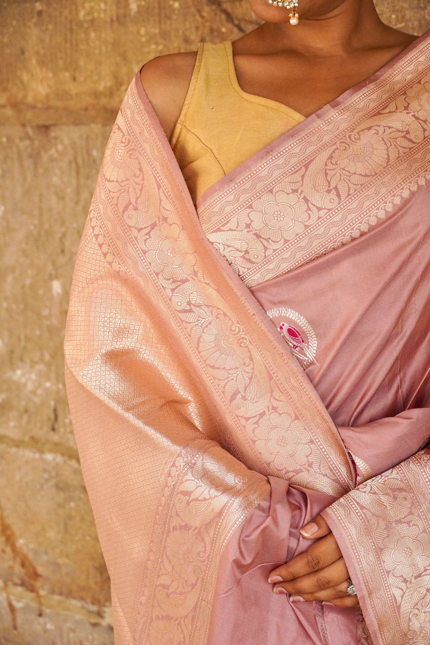 Evoke nature’s beauty with this Coral Peach Banarasi Katan Silk saree, intricately woven with Shikaargah motifs of birds amidst lush foliage. Meenakari work and exquisite zari detailing add a touch of timeless elegance.