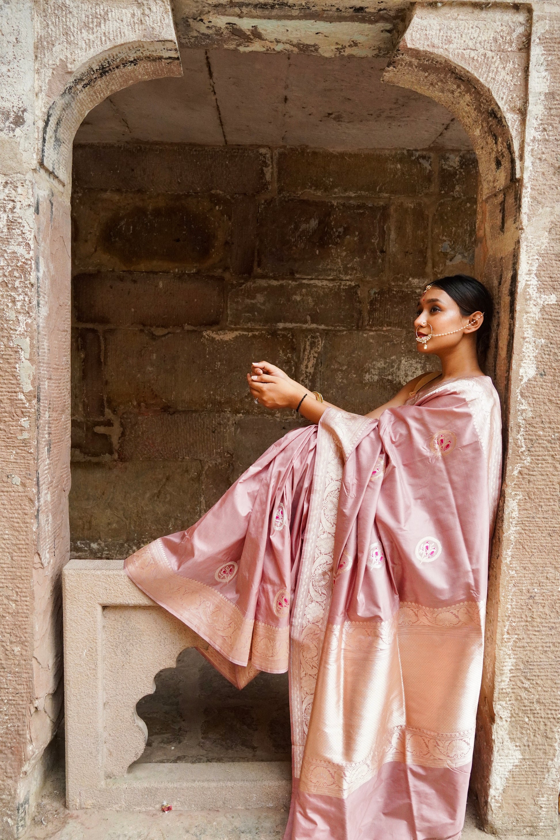 'Aayat' Coral Peach Floral Alfi Boota Katan Banarasi Saree