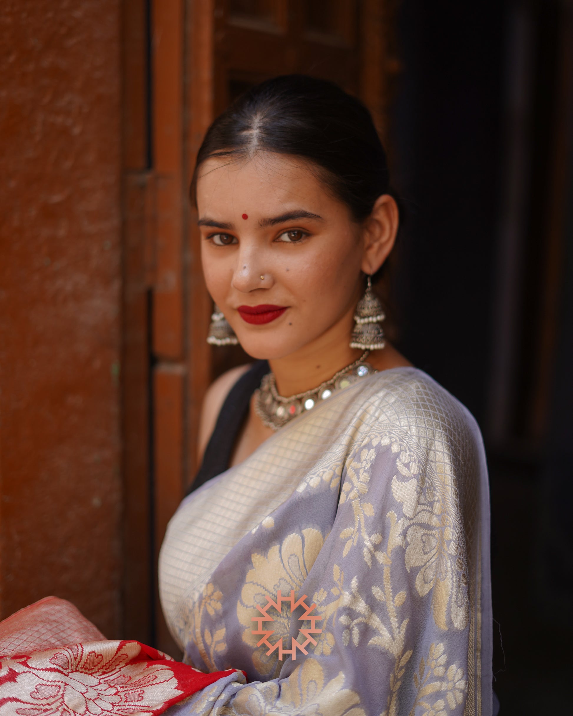 Banarasi Khaddi Georgette Saree, a symbol of sophistication for your wardrobe. The luxurious Roman Silver base intertwines with a gold zari stripe in vibrant red, complemented by a self-border adorned with intricate floral motifs and leafy designs. Complete with a self-pallu featuring stunning zari work, adding a touch of extravagance to any ensemble.