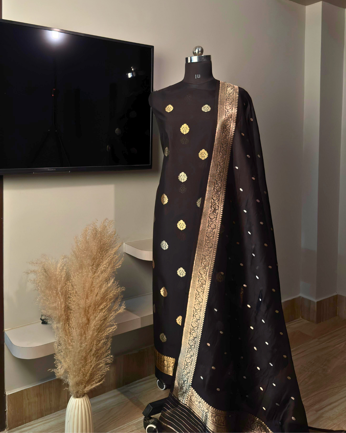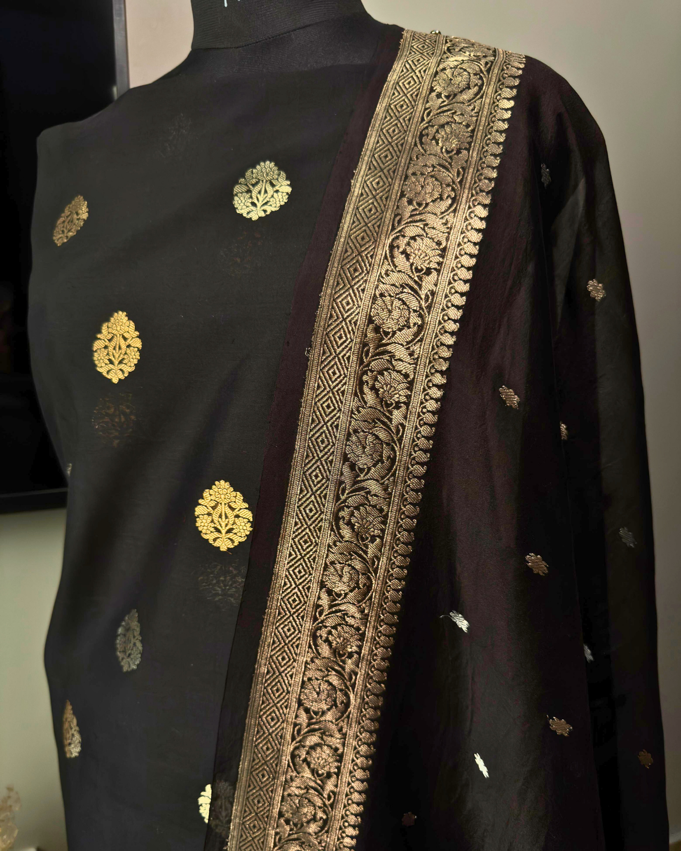 Black Pure Banarasi Mercerised Kora Handloom Kadwa Suit Set with Dupatta