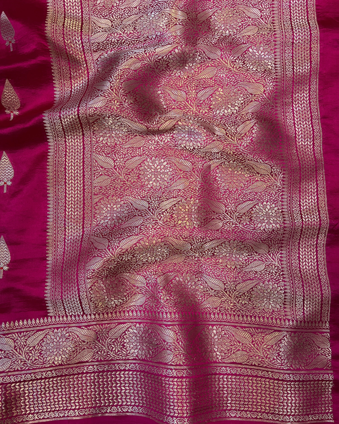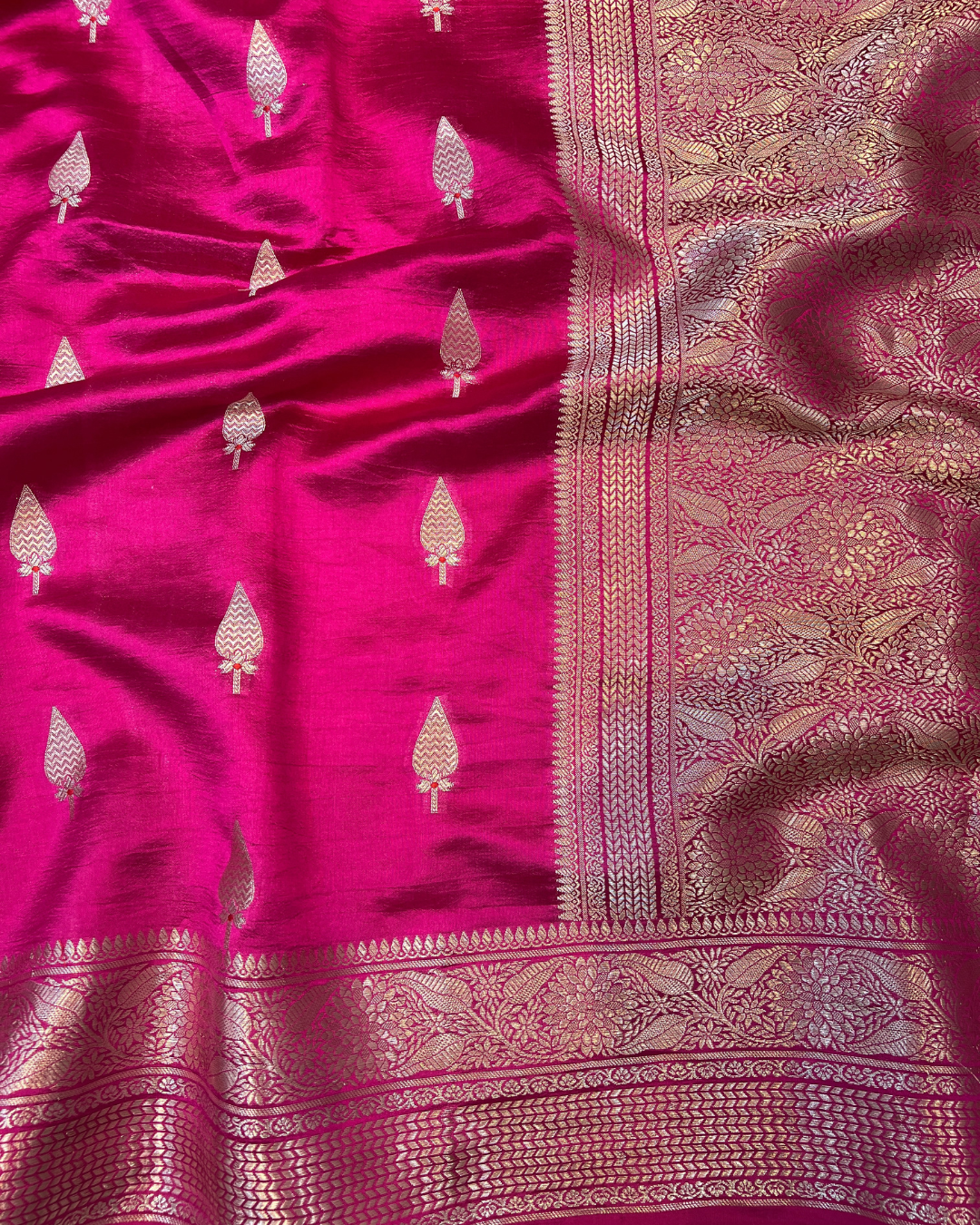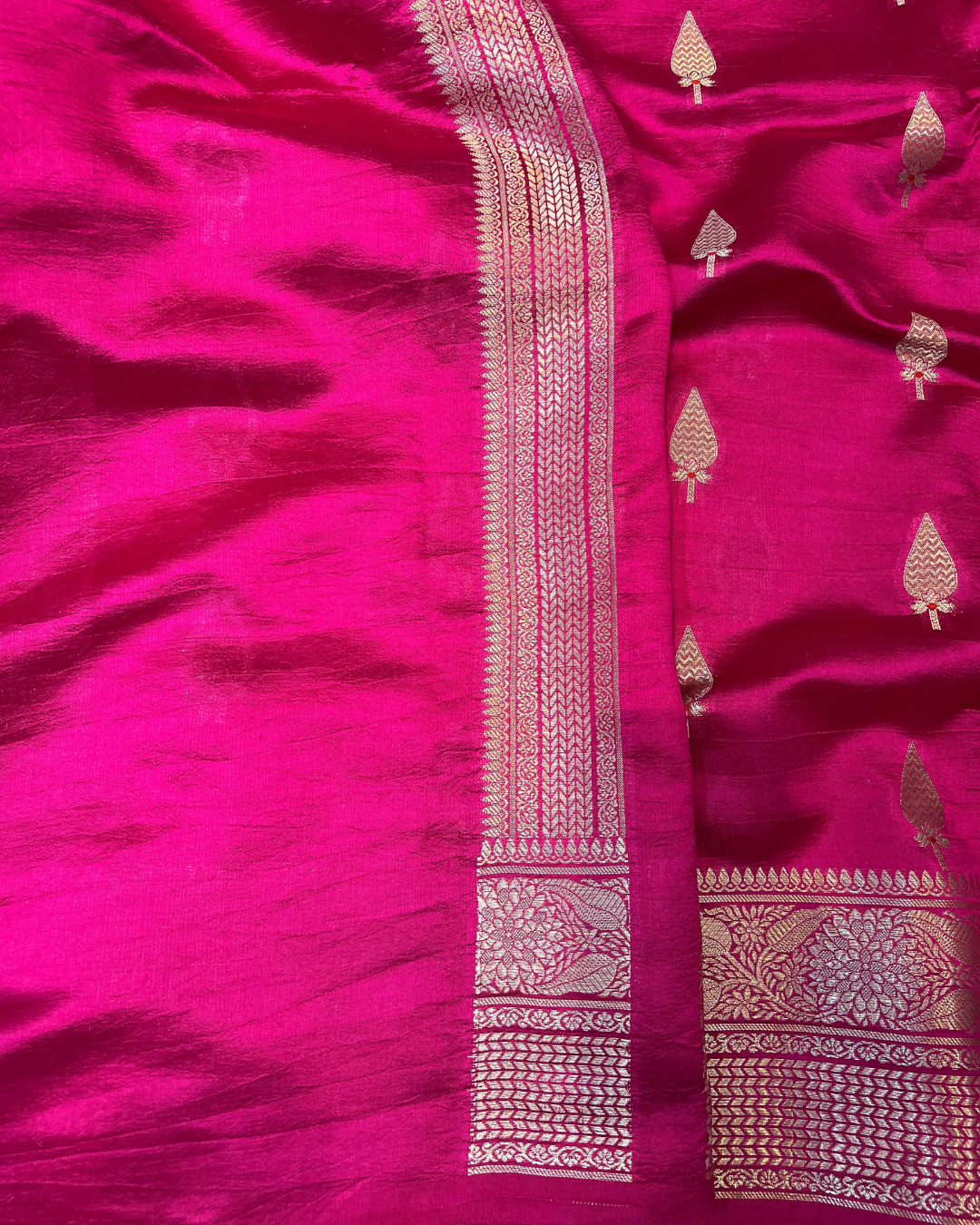 Effortlessly blending tradition with modern sophistication, our Deep Pink Raw Mango Silk saree in light gold captivates with its exquisite craftsmanship and luxurious silk fabric. Its rich color and intricate designs add an air of grace and refinement, making it a perfect choice for special occasions.