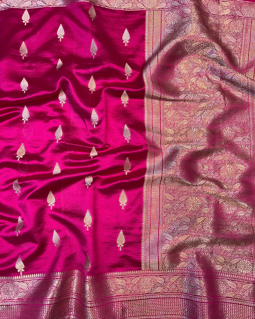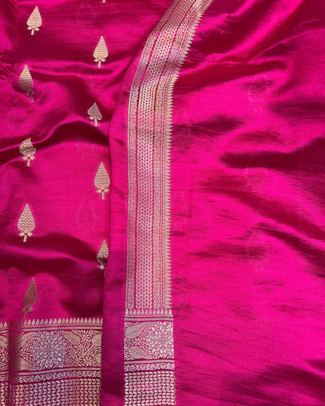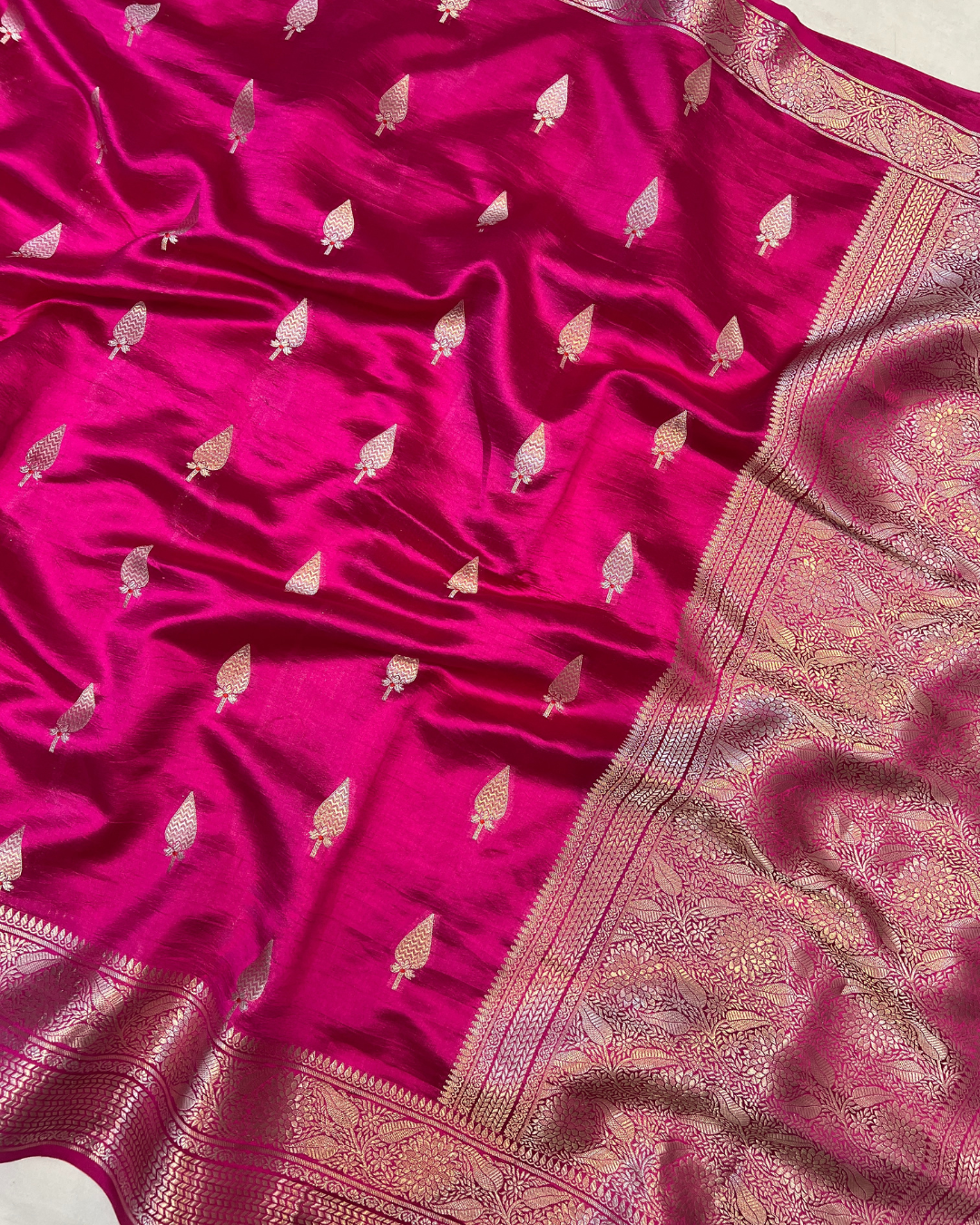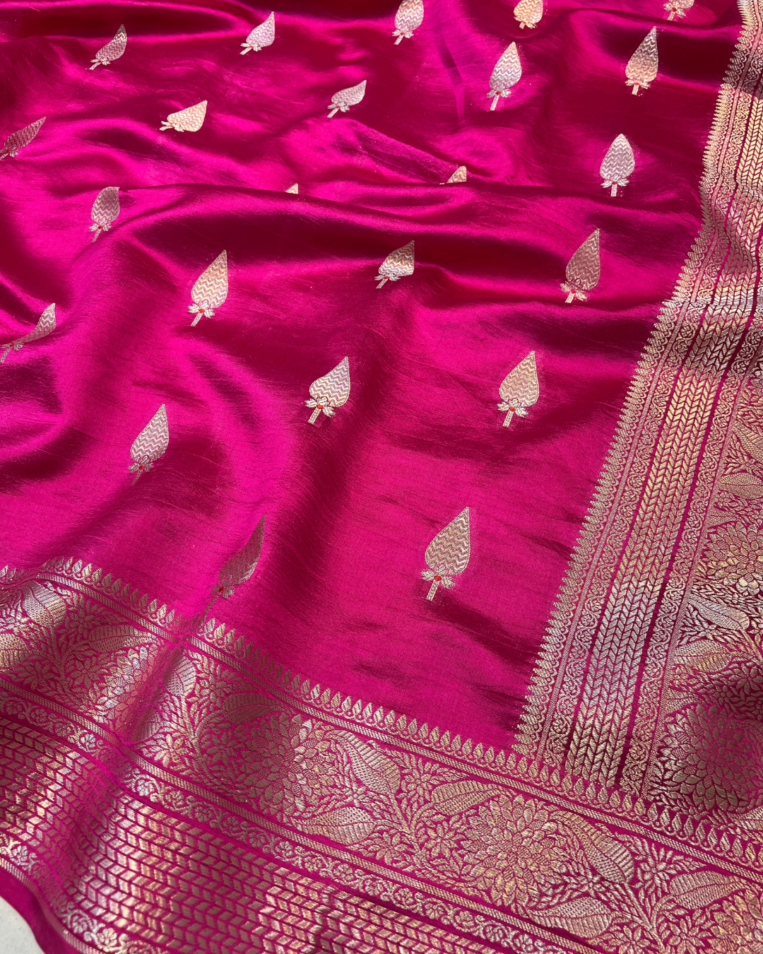 Effortlessly blending tradition with modern sophistication, our Deep Pink Raw Mango Silk saree in light gold captivates with its exquisite craftsmanship and luxurious silk fabric. Its rich color and intricate designs add an air of grace and refinement, making it a perfect choice for special occasions.