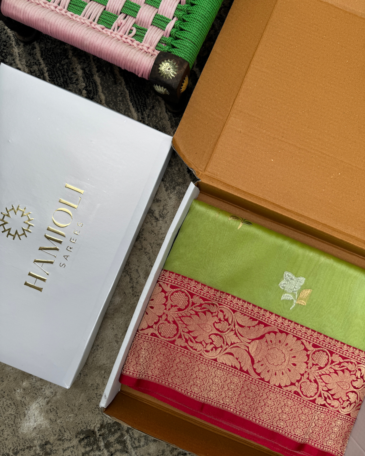 Specialty: A tribute to the rich Banarasi weave, combining floral zari bootas with a vivid red border that adds strength and celebration to the softness of pink.