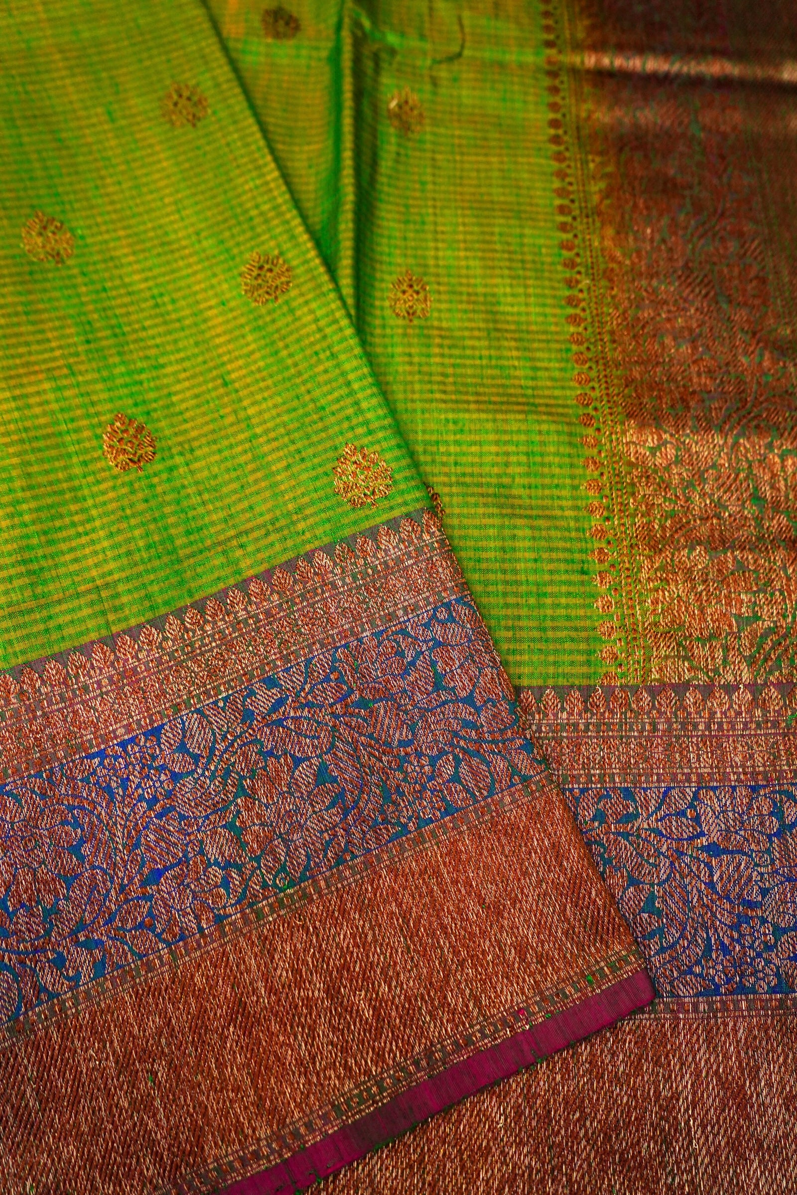 Vibrant and regal, this Green Dupion Handloom Silk Saree features intricate small floral zari bootas woven delicately across the body, radiating subtle charm and grace. The saree is beautifully accentuated with a multicolour designer heavy zari work border in a contrasting blue tone, adding a bold and luxurious touch.