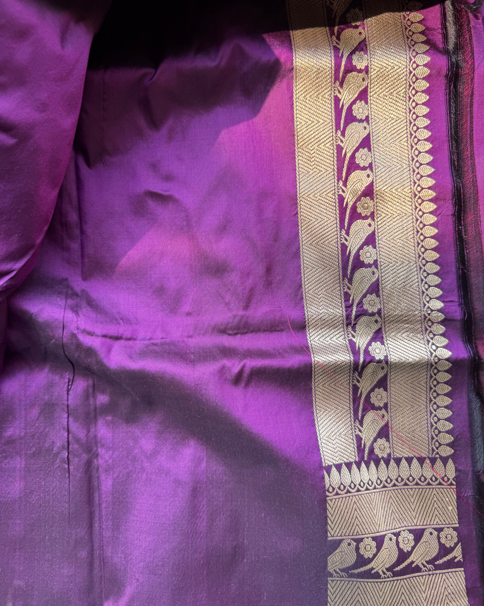 Discover the ethereal beauty of the Pure Banarasi Lavender Katan Ektara Silk Saree, enriched with exquisite bird motifs gracefully woven throughout and on the border.