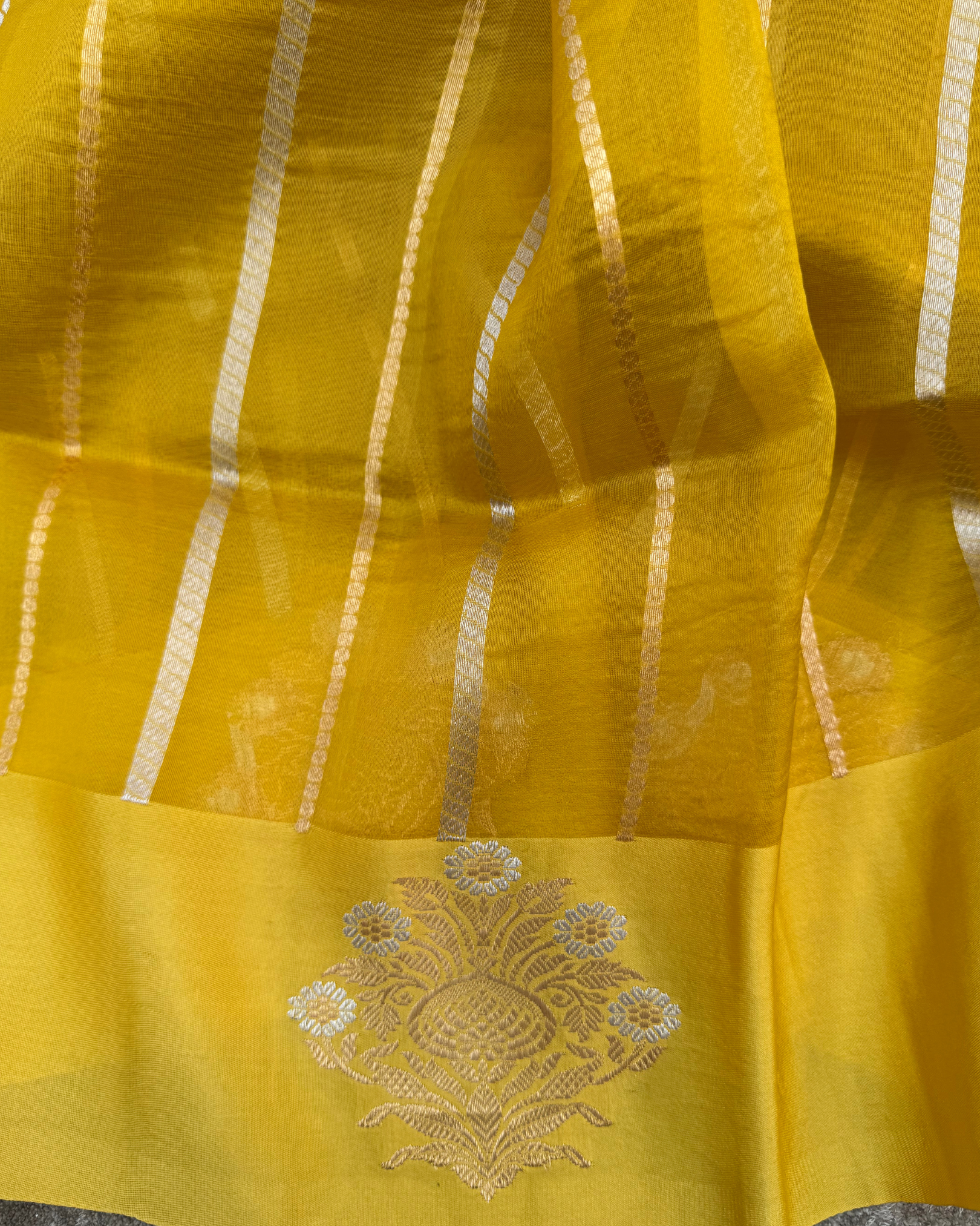 Celebrate artistry with our Banarasi Pure Kora Silk Handloom Saree in a radiant yellow shade. Adorned with exquisite Kadwa motifs in shimmering zari, this saree is a true embodiment of Banaras' rich weaving legacy.