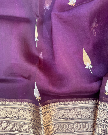 The Banarasi Pure Kora Silk Handloom Saree in Dark Purple colour is a blend of elegance and heritage. With intricate Kadwa zari motifs, this saree reflects the legacy of Banaras' master craftsmen.