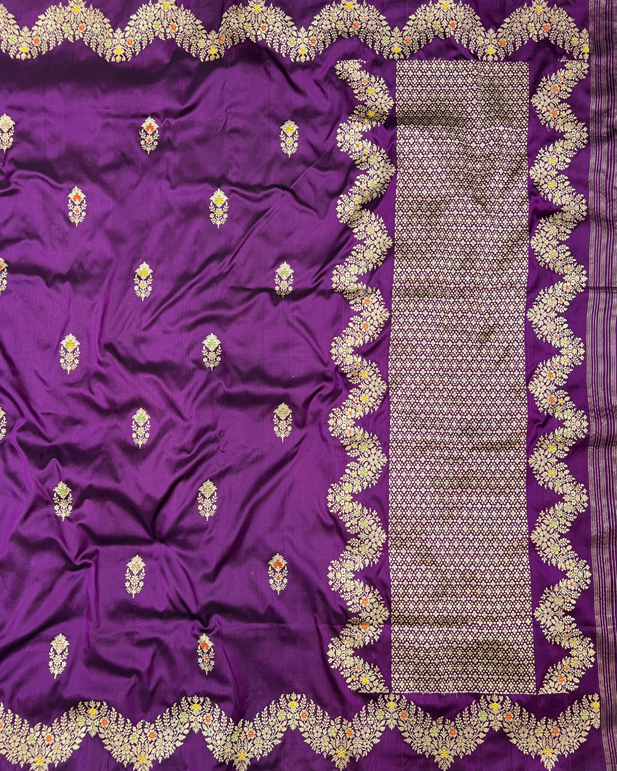 Embrace the timeless beauty of our Purple Handloom Banarasi Katan Boota Saree, a luxurious creation in pure Banarasi silk. Featuring intricately handwoven Kadhwa boota motifs, delicately highlighted with shimmering silver threads, this saree is a perfect blend of traditional craftsmanship and modern design. Ideal for special occasions and festive celebrations, this elegant saree adds a touch of regal sophistication to your wardrobe.