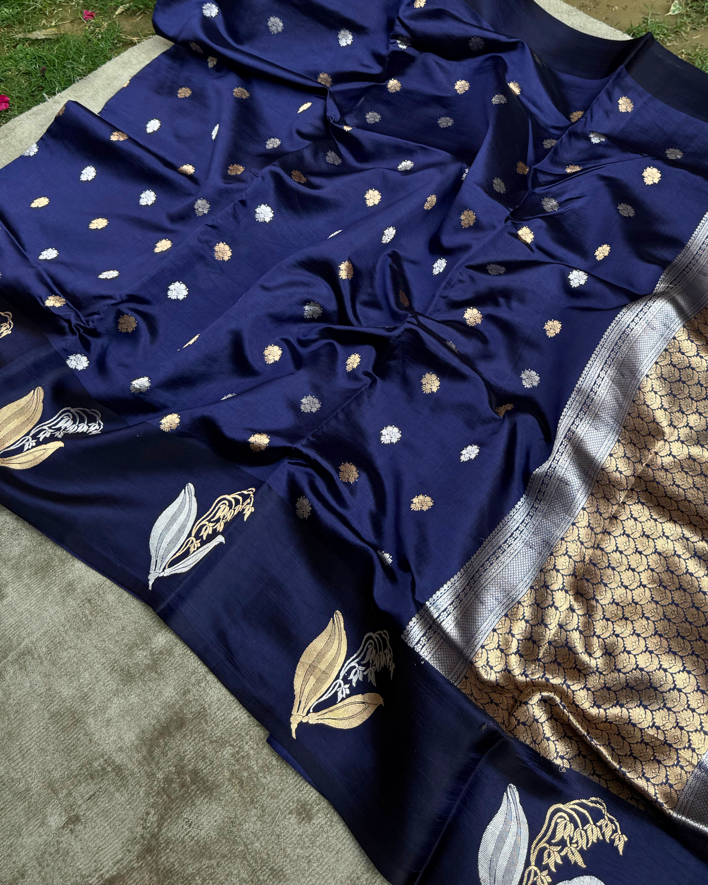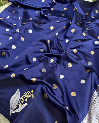 Unveil the charm of tradition with the Pure Banarasi Navy Blue Mulberry Soft Silk Saree, adorned with intricate floral leaf and flower motifs on the border, complemented by golden and silver floral bootas.