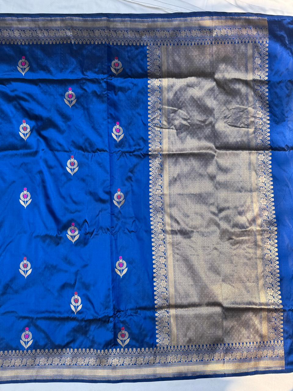 Woven from luxurious Pure Katan Silk, the saree flows with a royal drape and a natural, luminous sheen. The body is adorned with intricate Kadwa Meenakari Boota motifs, where each boota is woven individually on the handloom and delicately enhanced with meenakari detailing. This meticulous technique lends the saree remarkable depth, richness, and heirloom-quality finesse.