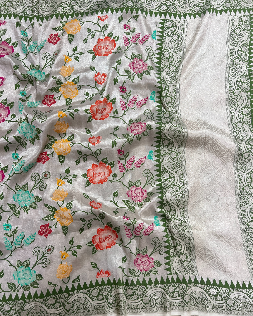 Elevate your wardrobe with the timeless elegance of our Pure Tissue Tussar Georgette Saree in a refined ash white hue, perfect for both grand events and special occasions. This saree is beautifully adorned with an intricate floral jaal design, handwoven with authentic Meenakari work. The elegant ash white base is further enhanced by a striking green and silver zari border, adding a sophisticated touch that brings out the beauty of the entire ensemble. The blend of silver and green tones with delicate craftsmanship creates an exquisite look that is sure to turn heads.