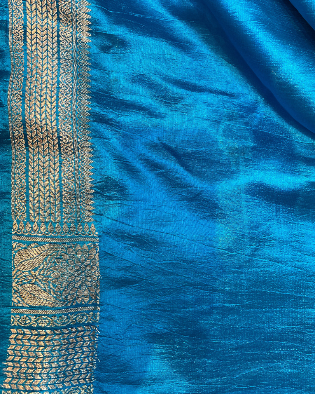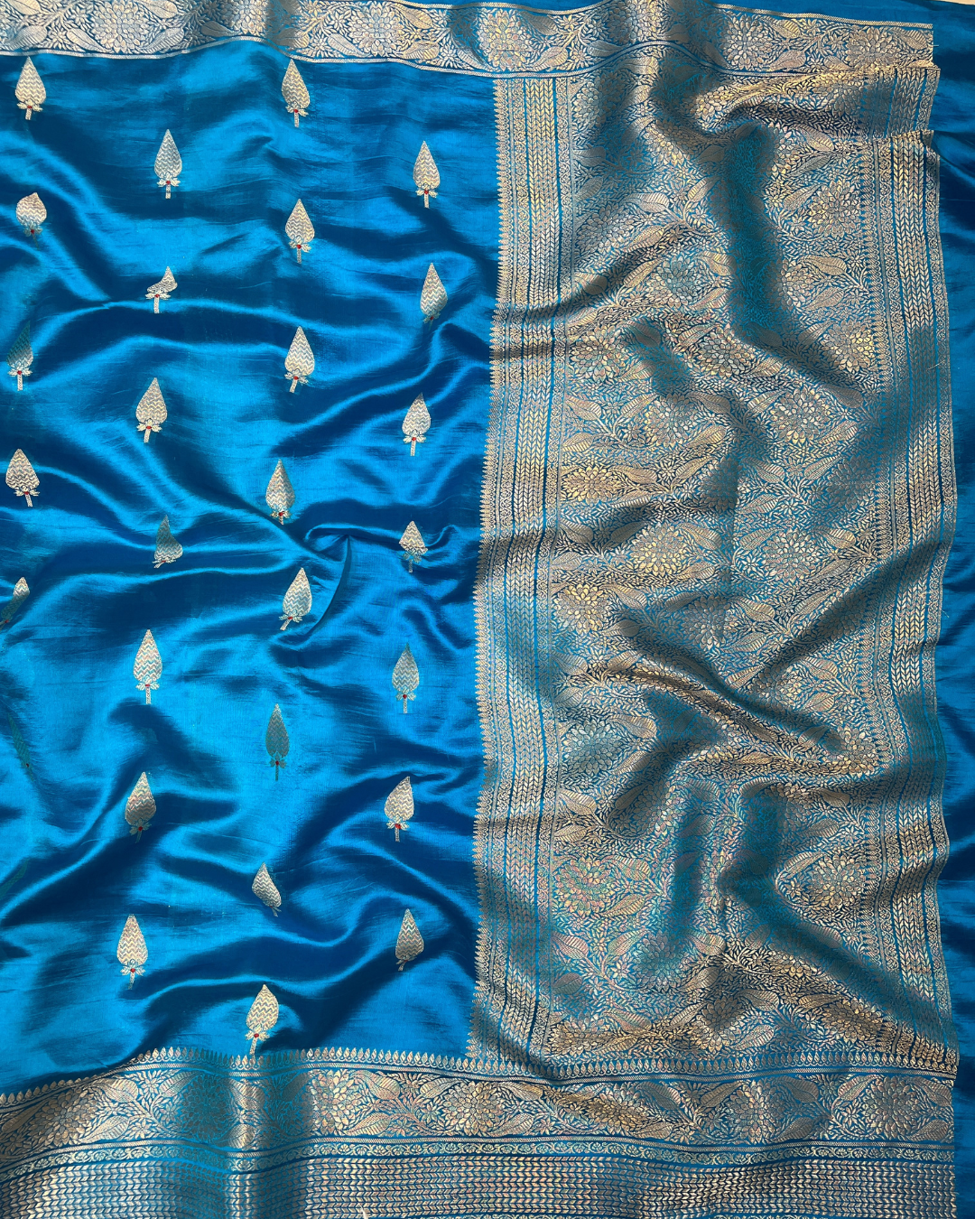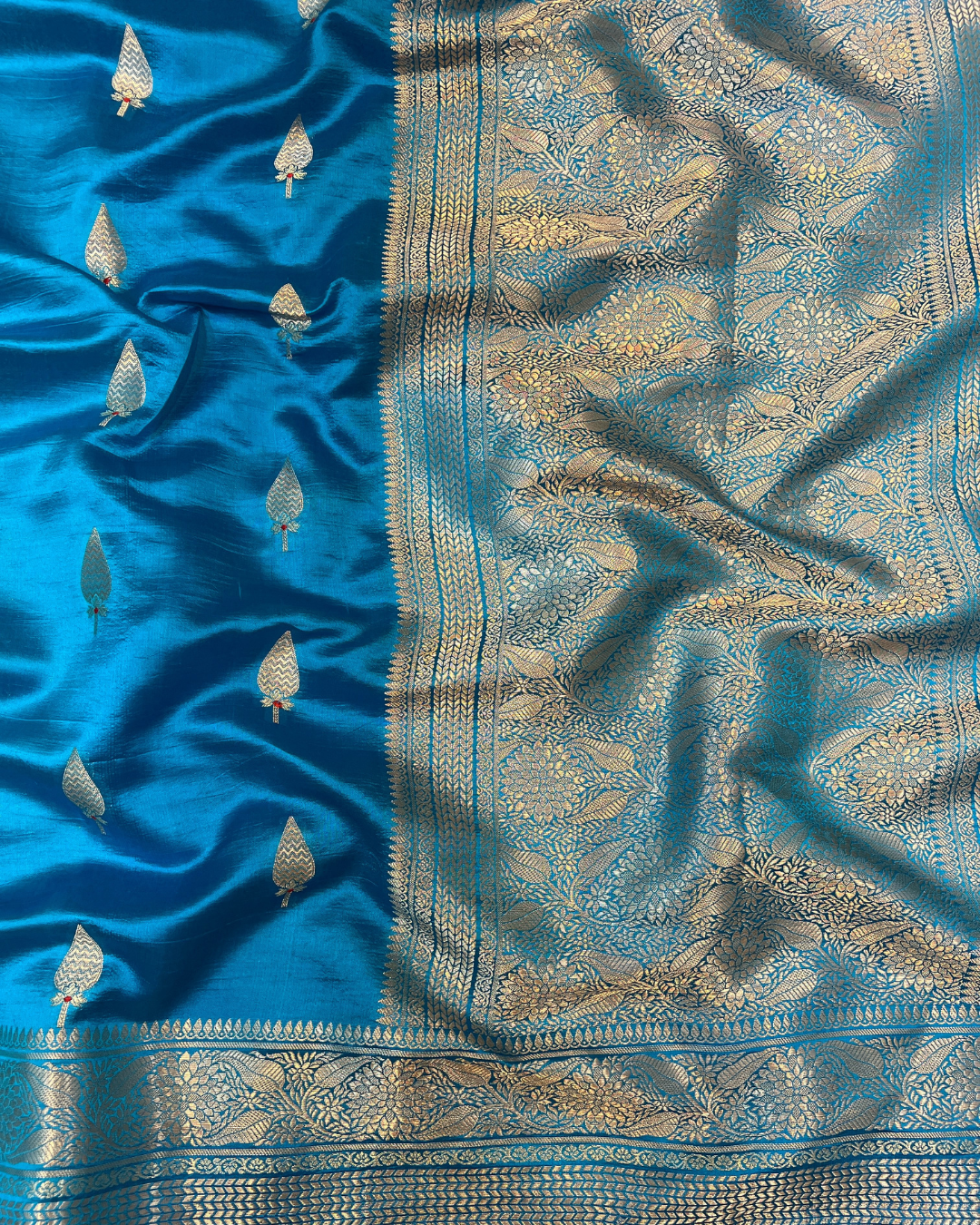 Radiating with elegance, our Orchid Blue Raw Mango Silk saree in light gold is a timeless work of art. The intricate designs and luxurious silk fabric make this saree a perfect blend of tradition and modern flair, embodying grace and beauty in every drape.