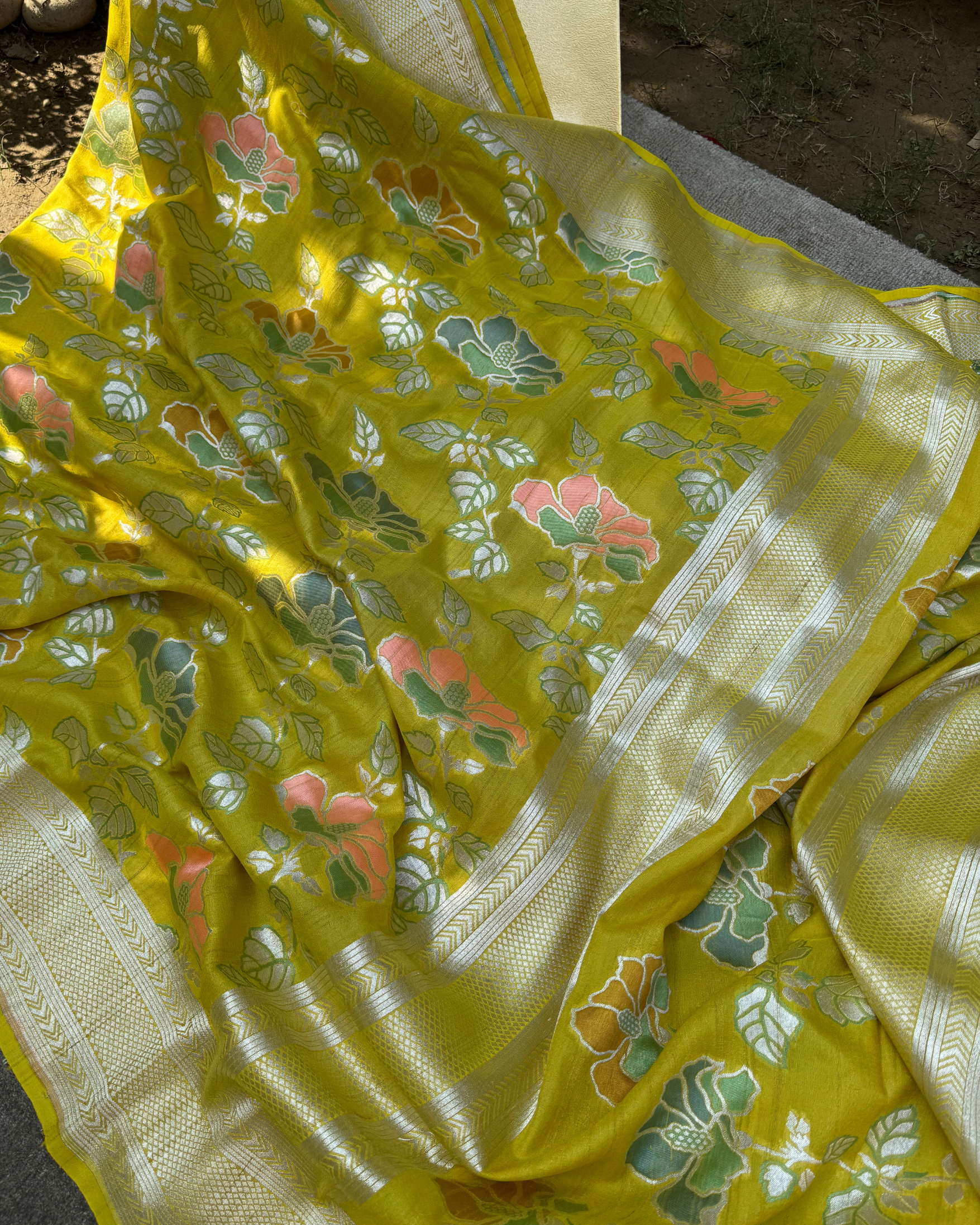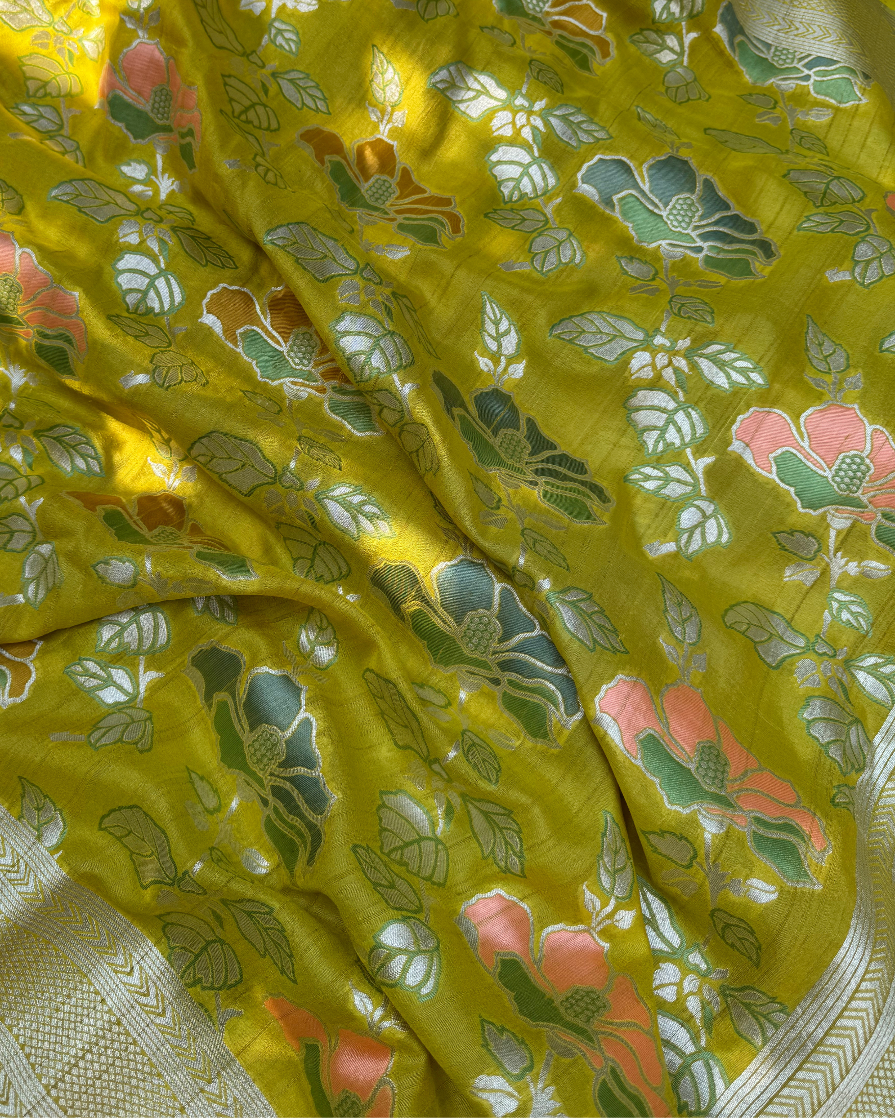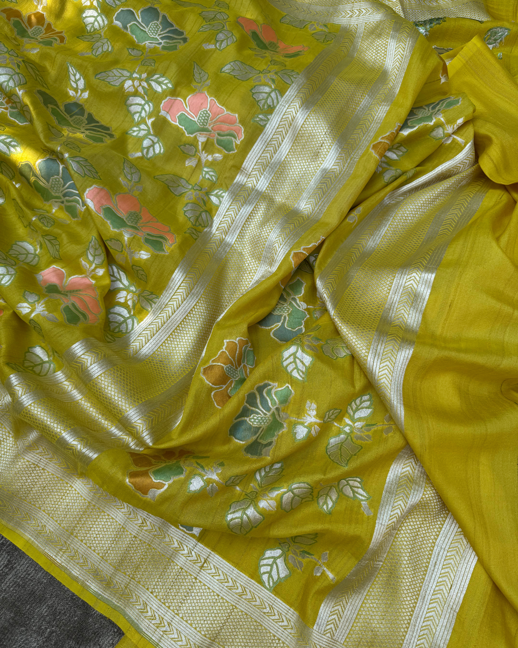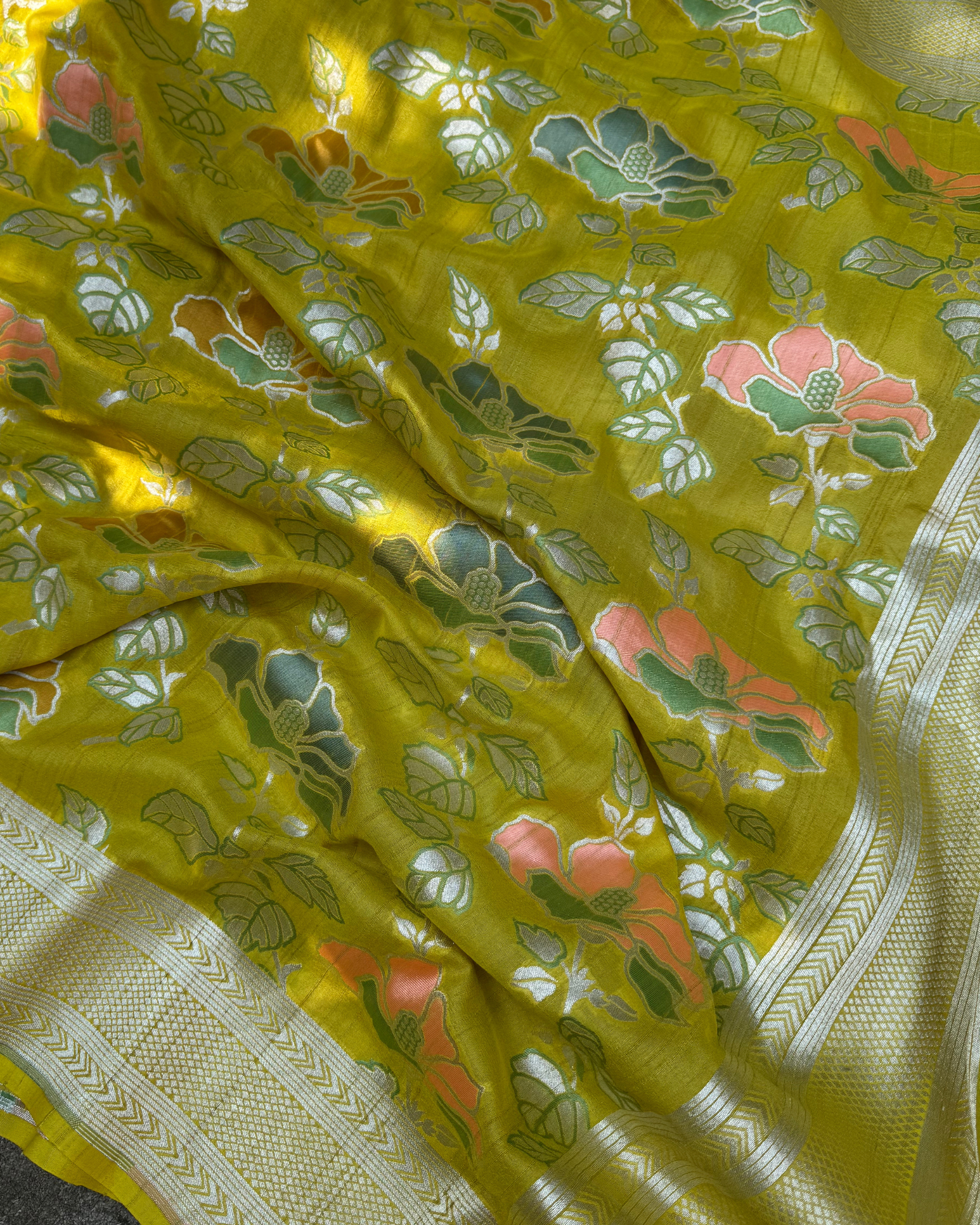 Parrot Green Pure Banarasi Tussar Georgette Saree