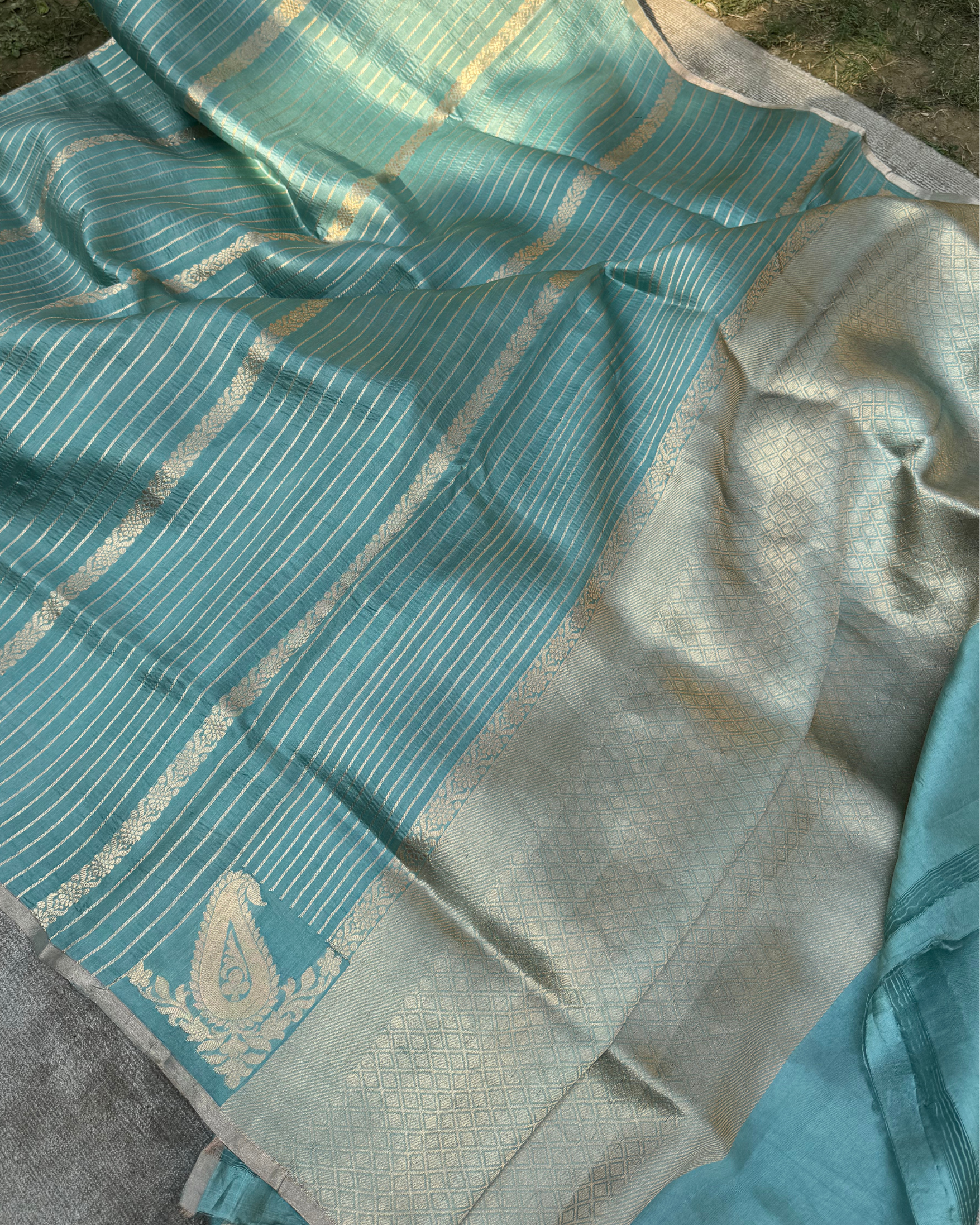 Indulge in luxury with our stunning Blue Raw Mango Silk Saree in light gold. Crafted from rich silk and adorned with delicate designs, this saree effortlessly blends tradition with modern elegance. A true embodiment of timeless grace, it’s the perfect choice for making an unforgettable statement.