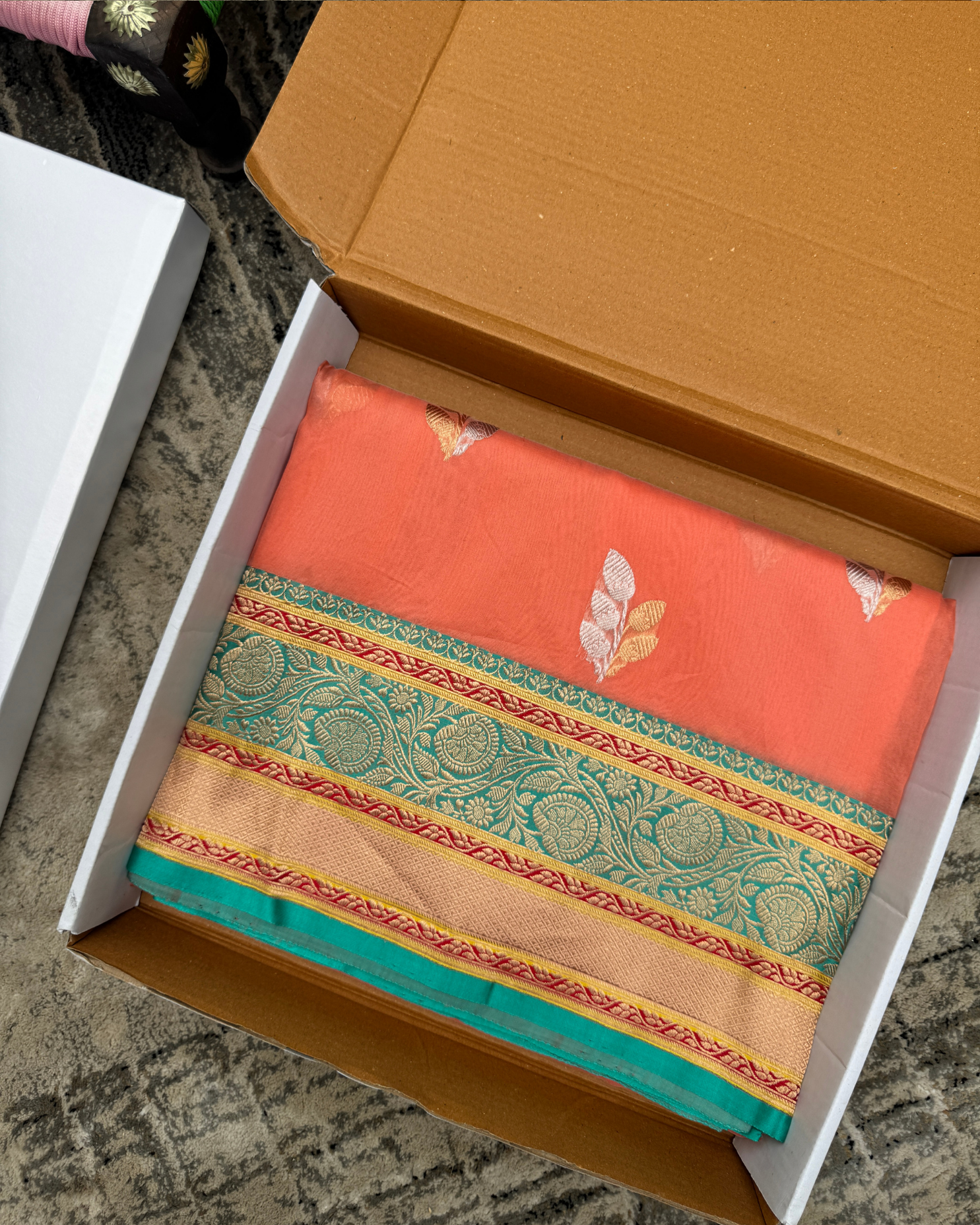 A timeless masterpiece from the heart of Banaras, this Banarasi Handloom Double Kora Katan Saree captures the essence of subtle elegance. The body of the saree comes in a soft peach hue, adorned with delicate leafy boota designs in shades of gold and silver zari, exuding a soft, graceful shimmer. Framing this beauty is a stunning contrast floral border in bold green, enhanced with intricate gold detailing that brings out a regal vibrance and festive charm.