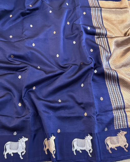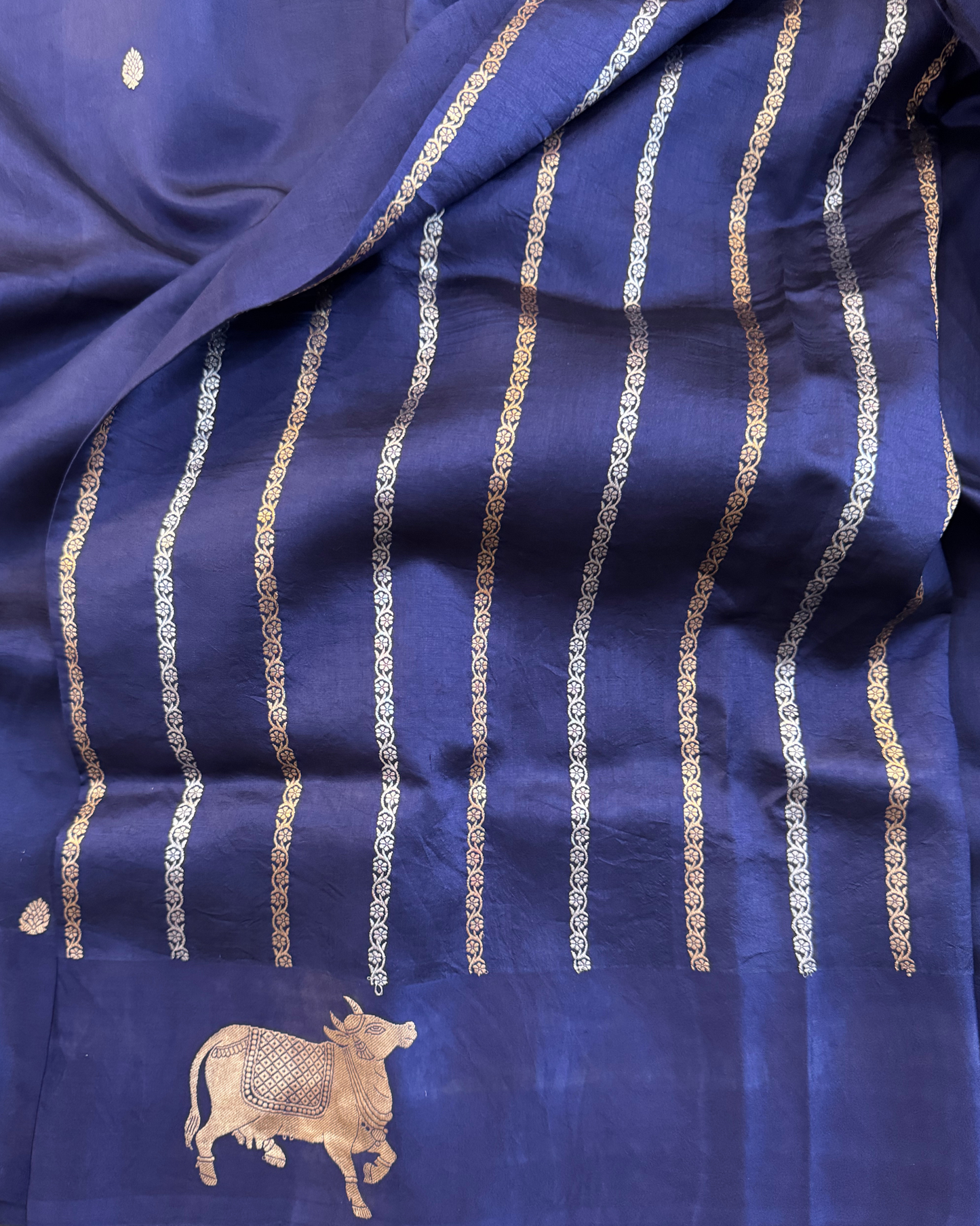The Pure Banarasi Purple Mulberry Soft Silk Saree is a masterpiece of tradition, featuring small Shankh bootas and a unique border adorned with intricate cow motifs.