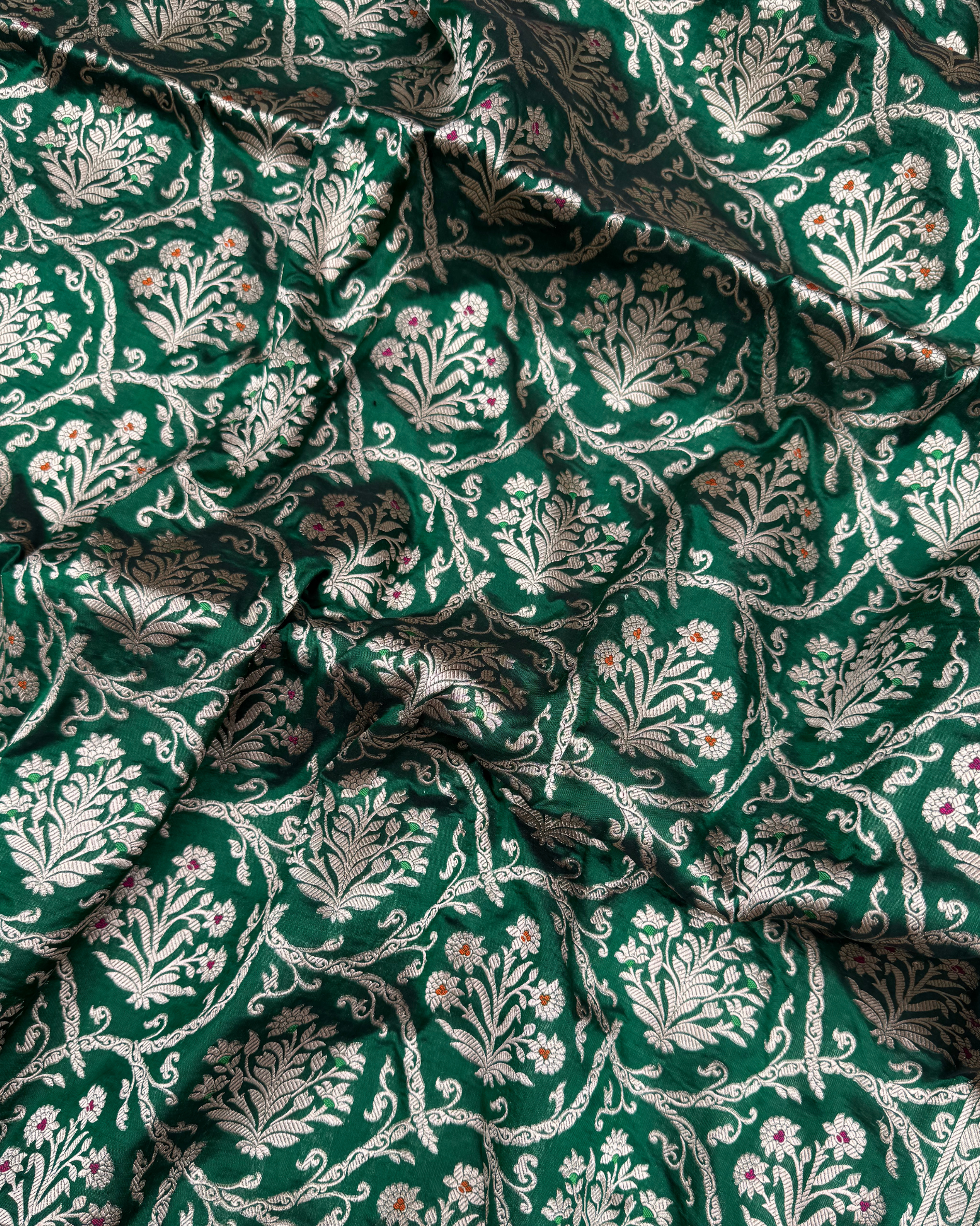 Celebrate the artistry of Banaras with this Green Banarasi Katan Jangla Silk Saree, beautifully designed with intricate floral motifs and lustrous zari work. Perfect for special occasions, this saree is an embodiment of heritage and charm.