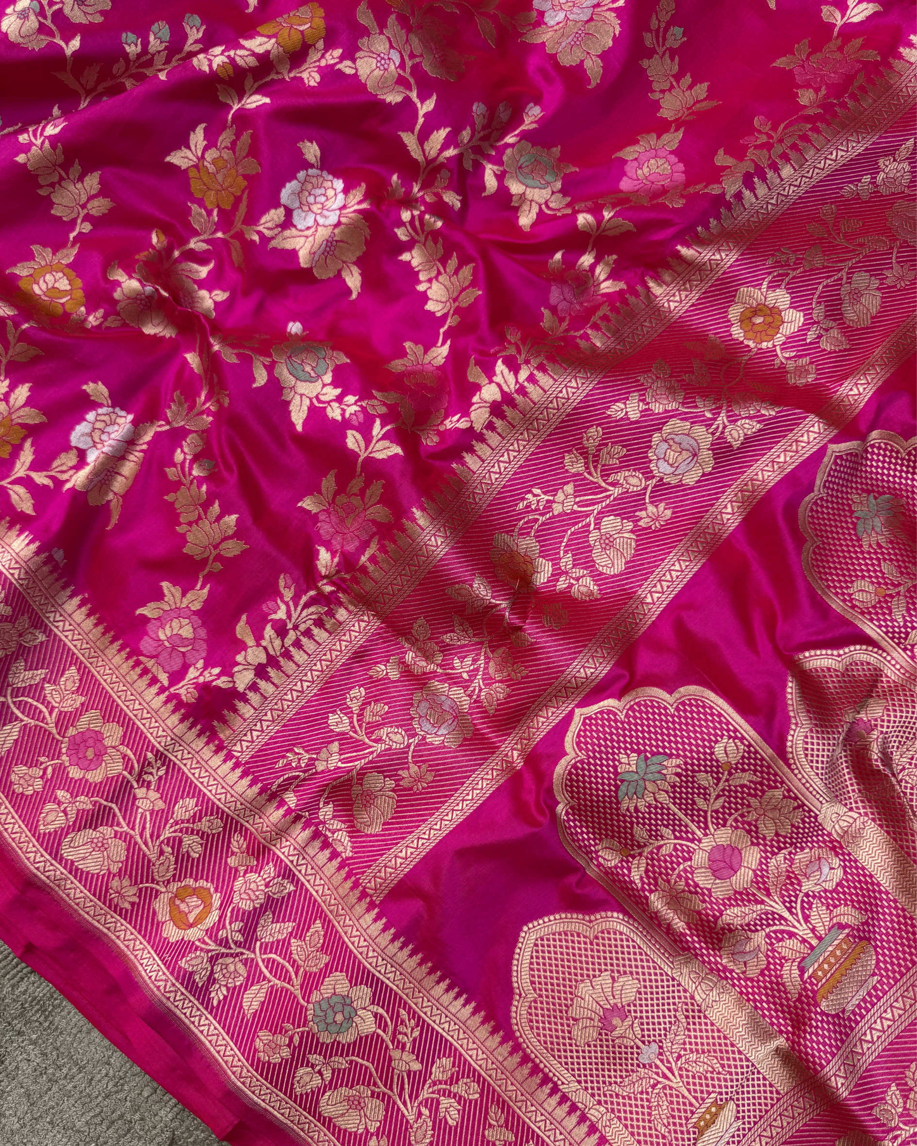 Radiating elegance and charm, the Pure Dark Pink Banarasi Katan Jangla Silk Saree showcases intricate floral jaal patterns and stunning zari work. This handcrafted red saree is a symbol of timeless beauty, perfect for any festive or formal occasion.