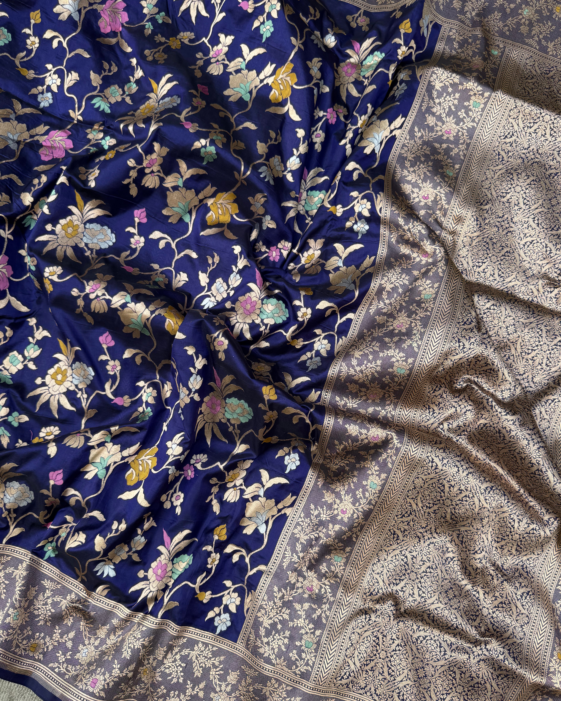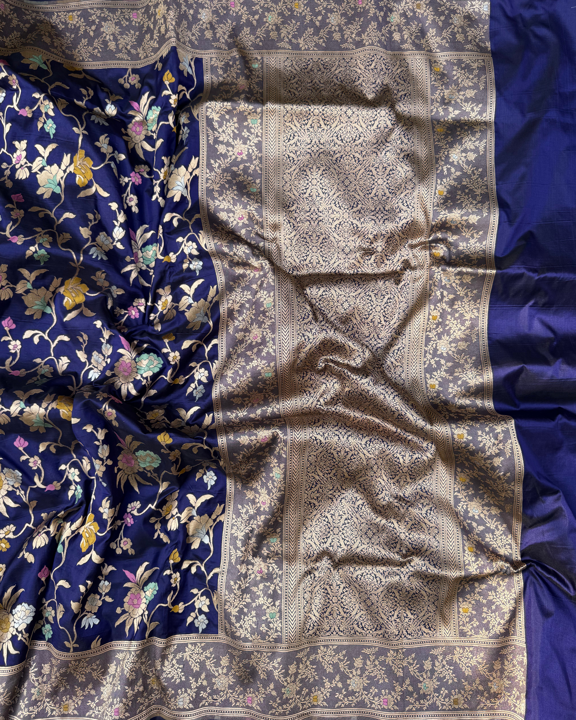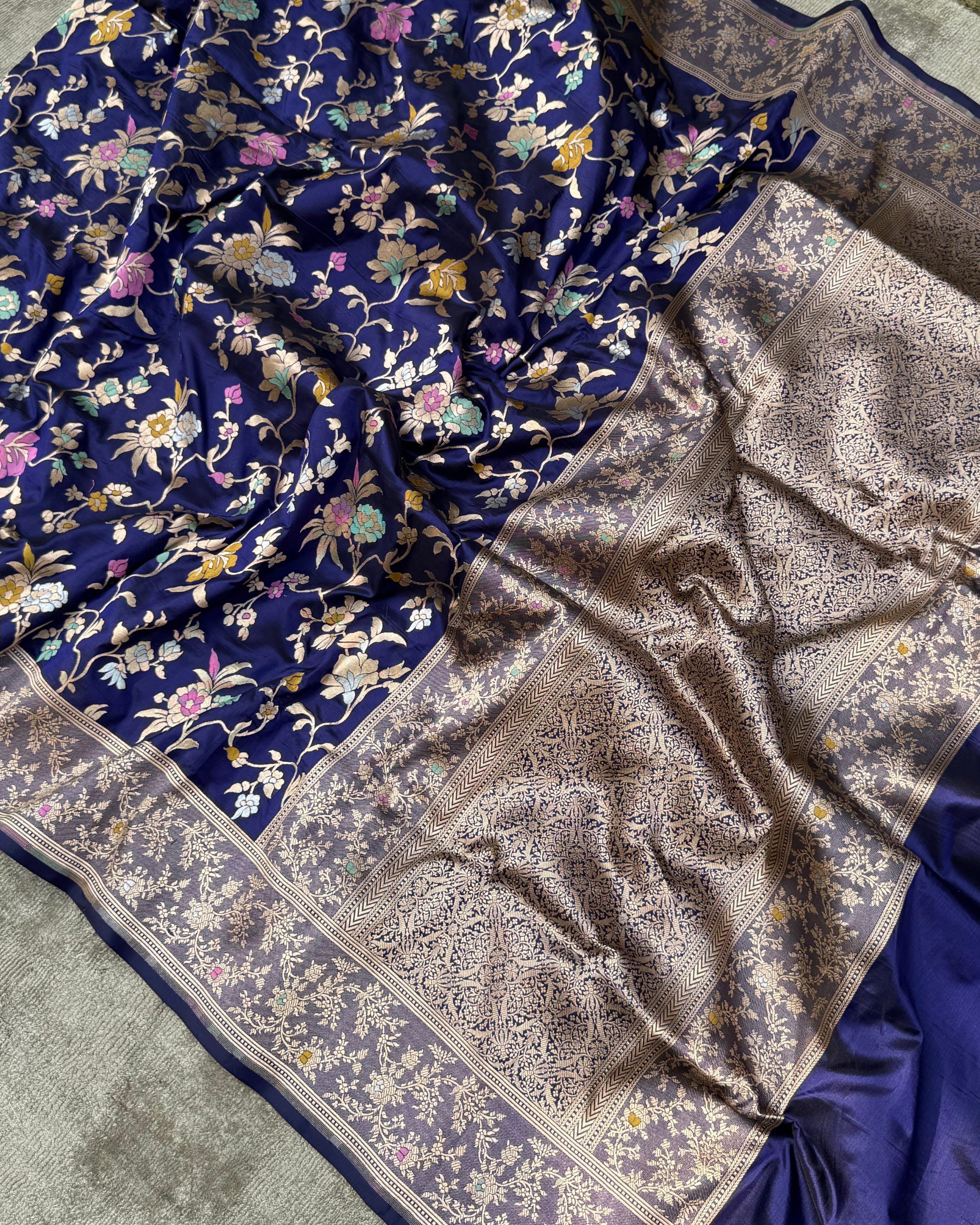 Drape yourself in luxury with the Dark Purple Banarasi Katan Jangla Silk Saree, inspired by blooming flowers and featuring detailed floral motifs in shimmering zari. A stunning choice for those who admire the elegance of handloom artistry.