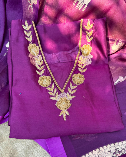 Purple Pure Silk Hand-Embroidered Suit Set with Handwoven Dupatta