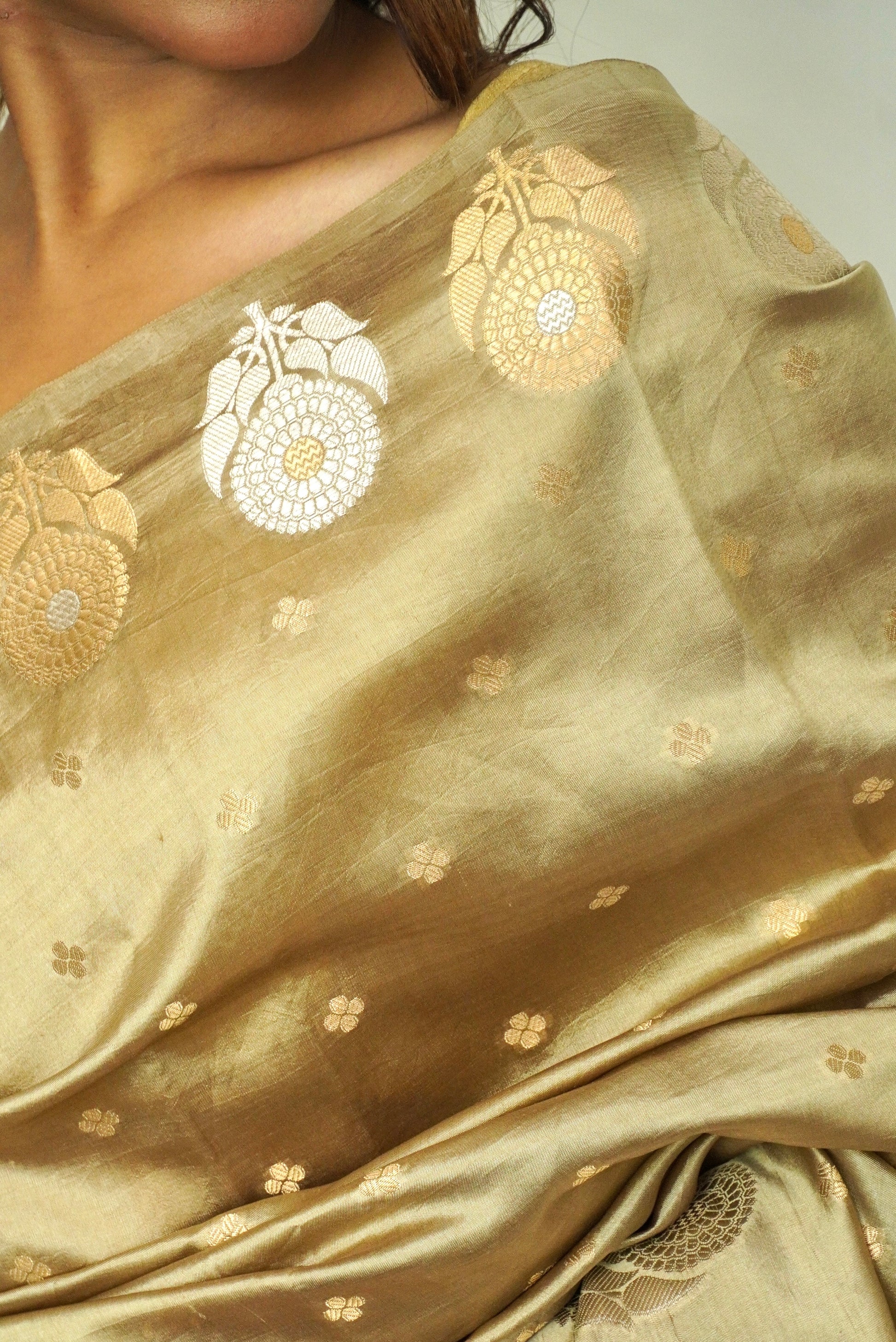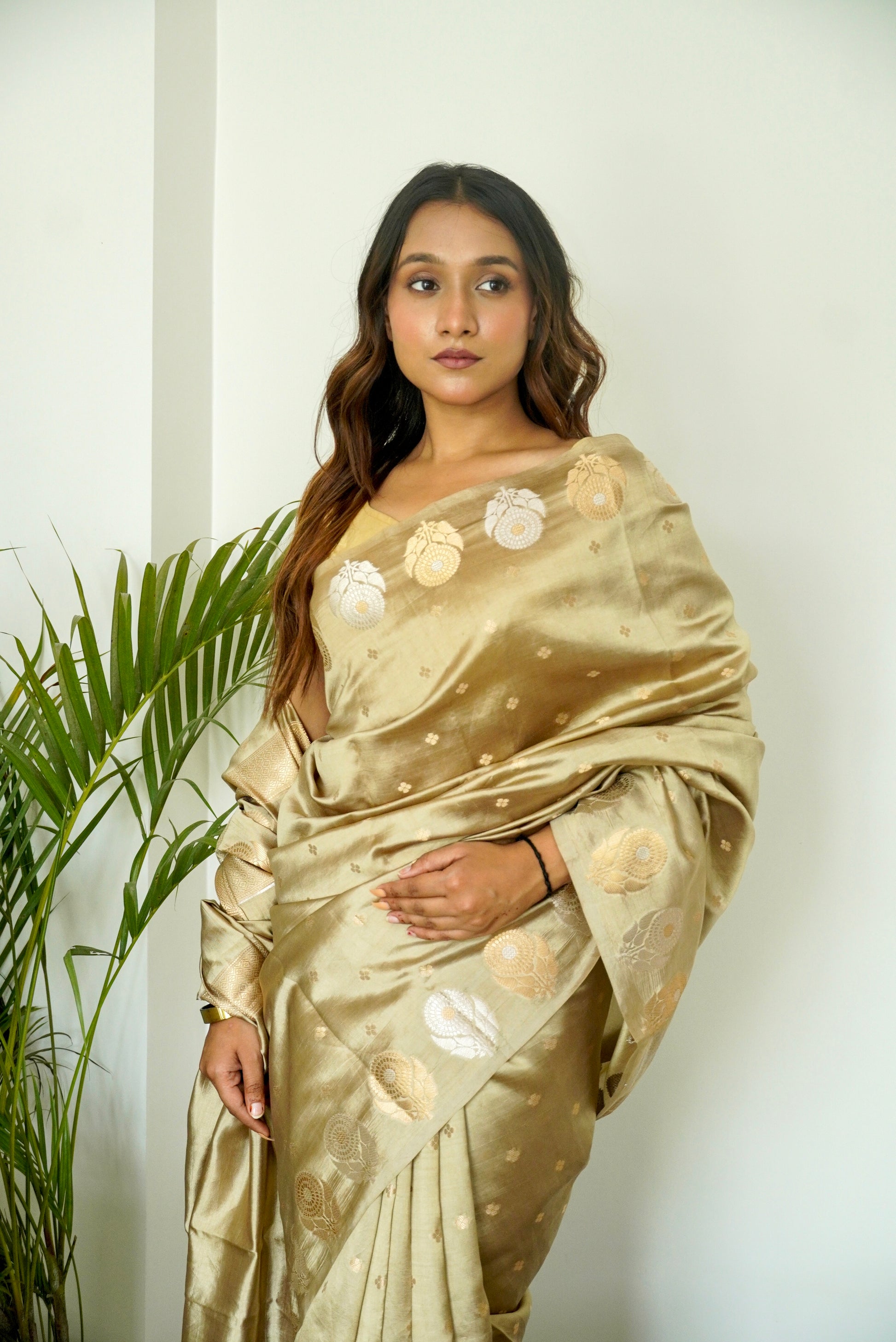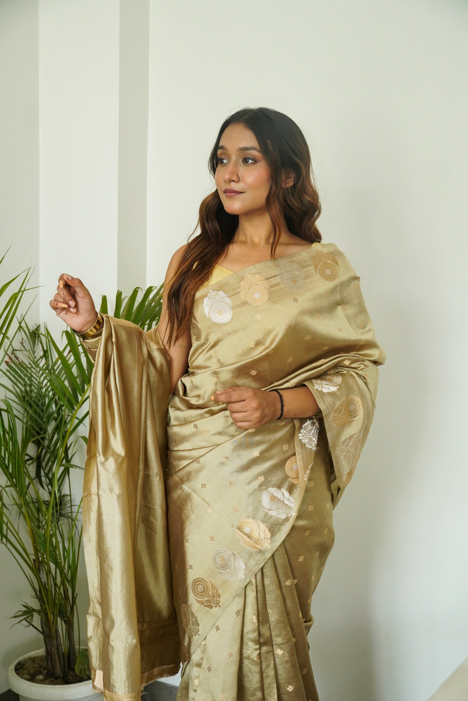 Opulent and radiant, our Light Gold Raw Mango Silk saree exudes timeless sophistication. This saree, crafted with finesse, features lustrous silk fabric adorned with exquisite designs. The light gold hue perfectly blends tradition and modernity, captivating with its rich color and intricate details, embodying grace in every fold.
