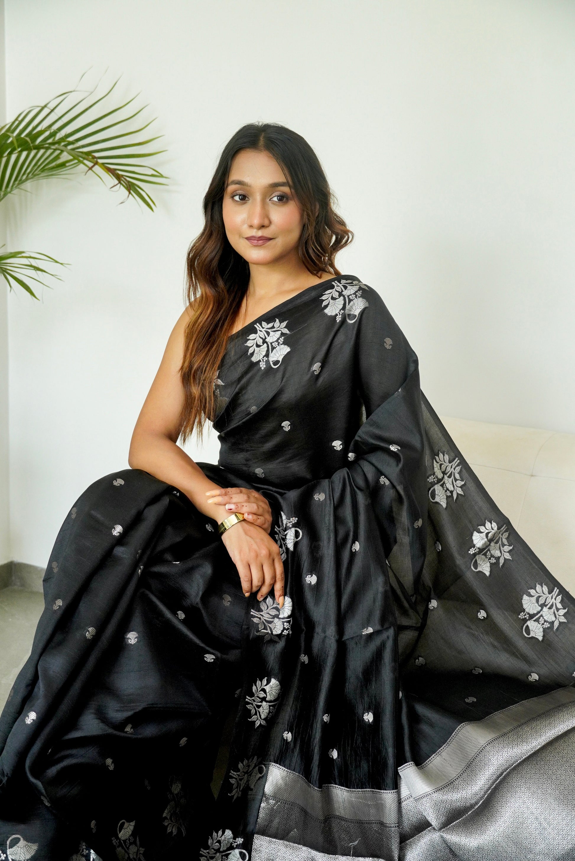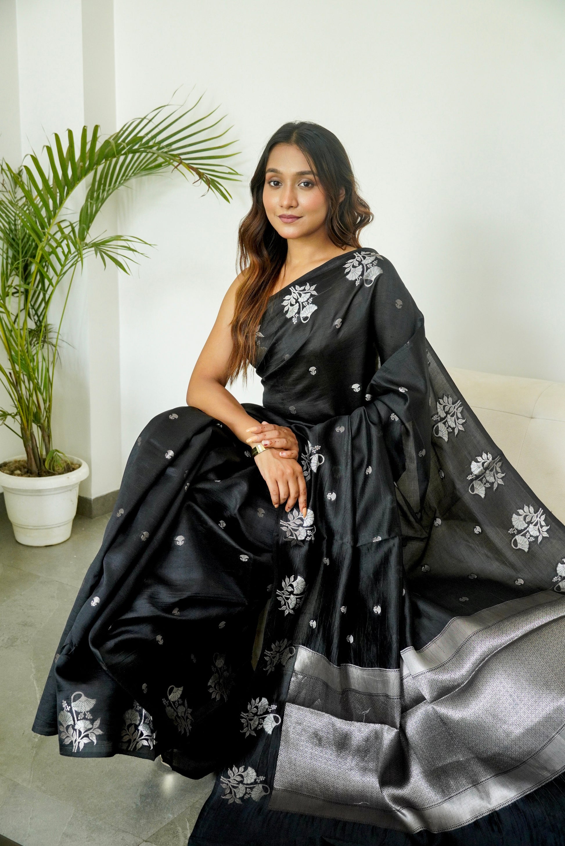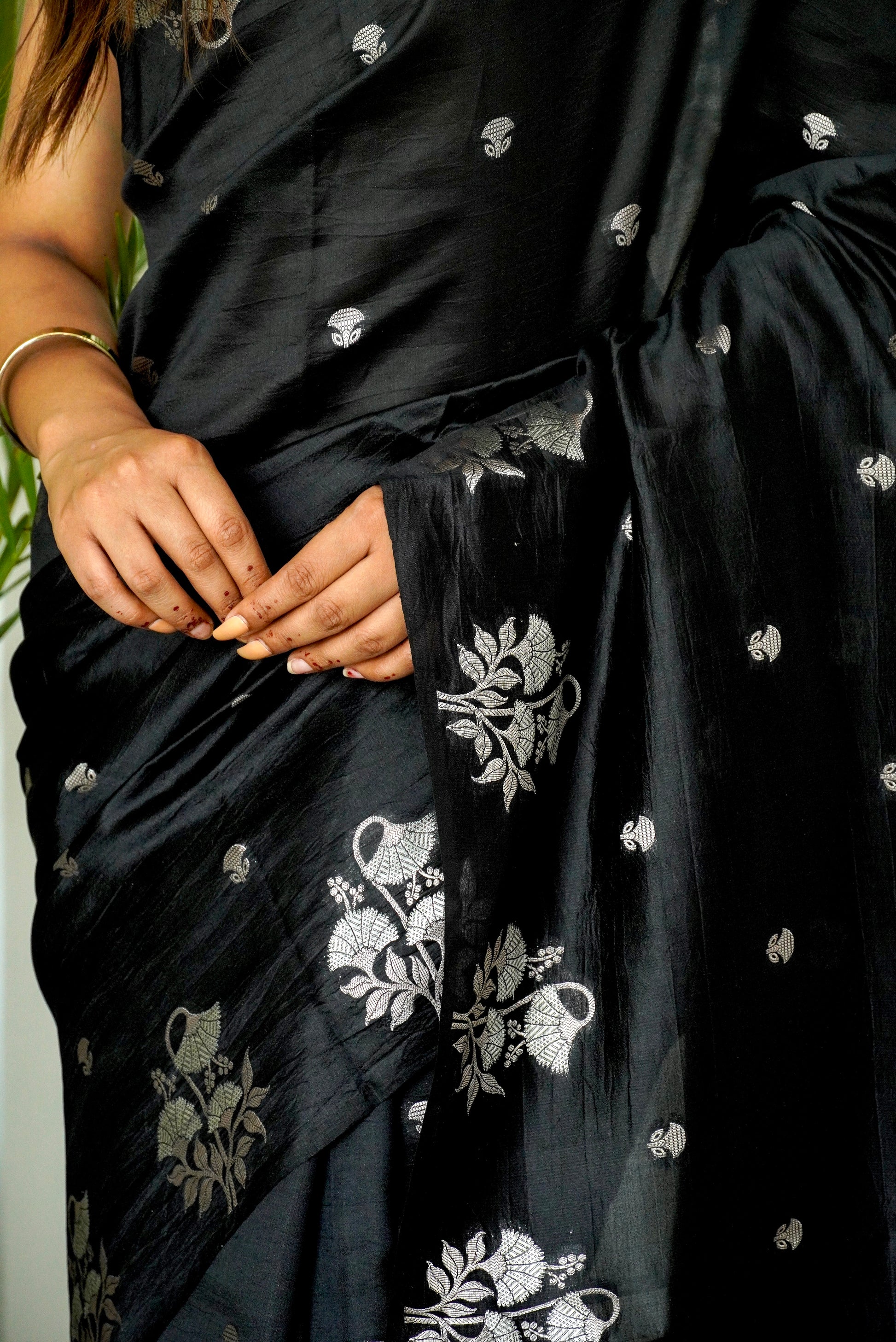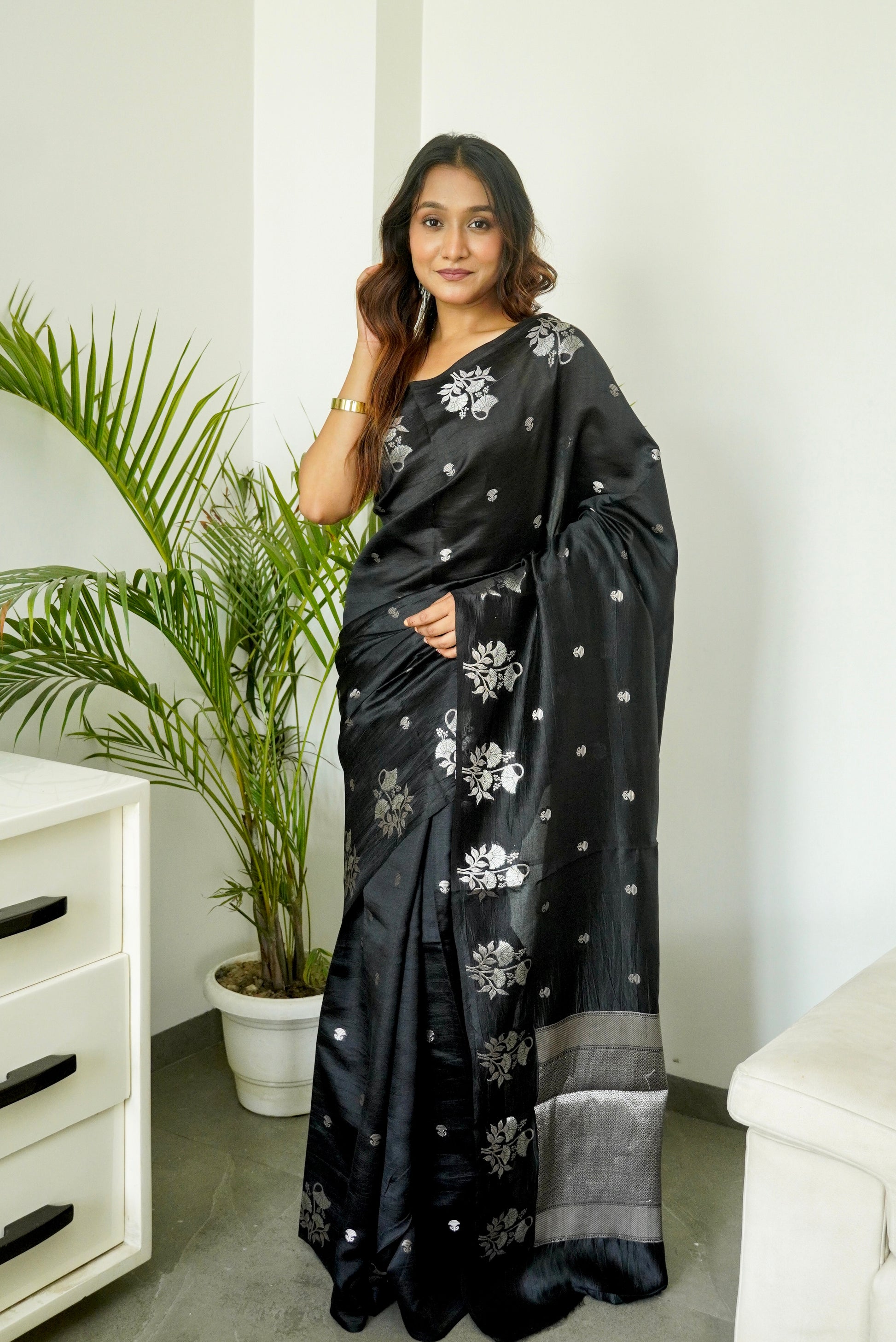 Our elegant Black Raw Mango Silk saree radiates timeless charm. Crafted with care, the lustrous black silk fabric showcases exquisite designs, making it a perfect blend of tradition and modernity. Understated yet striking, this saree captivates with its deep color and intricate details, embodying grace in every drape.
