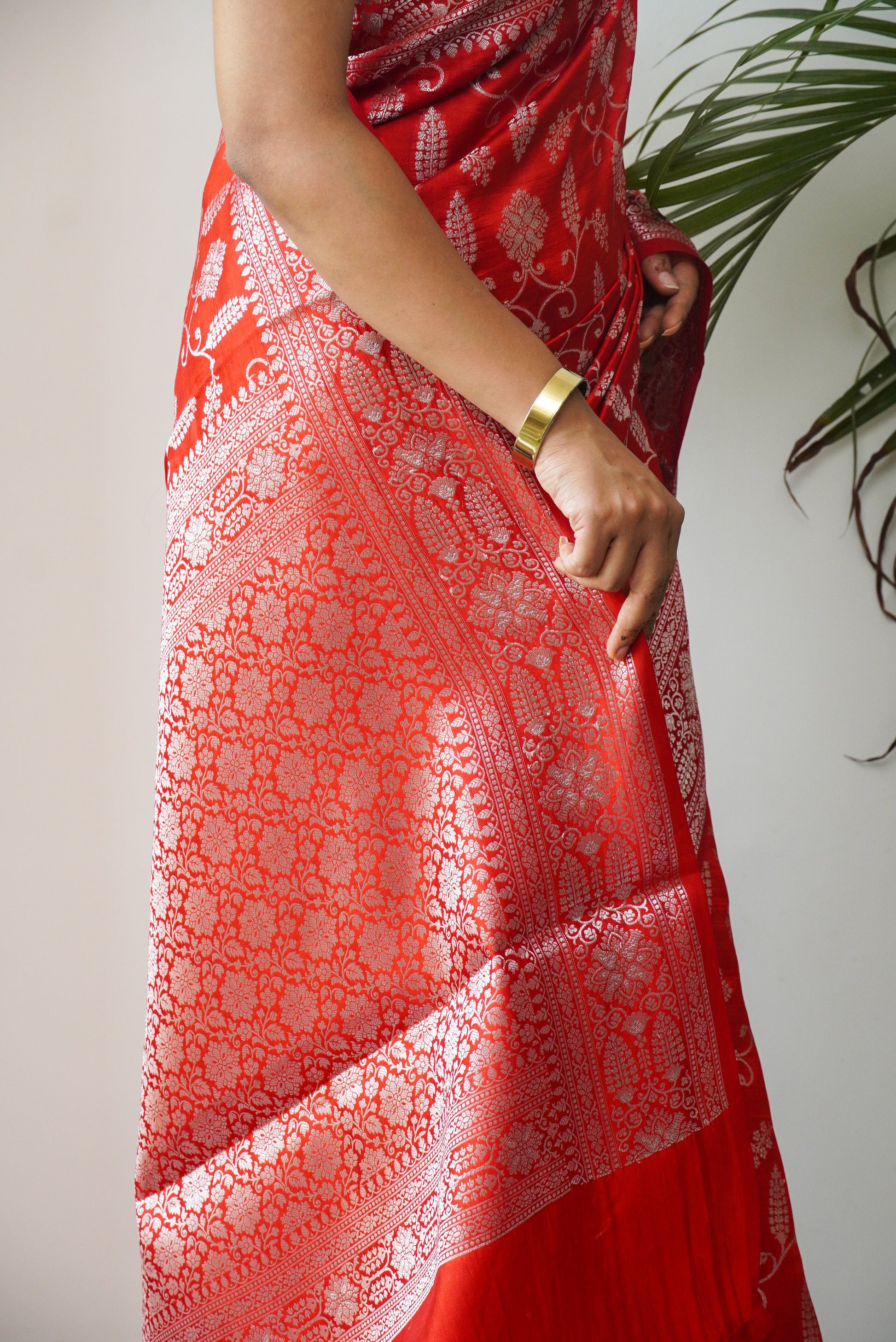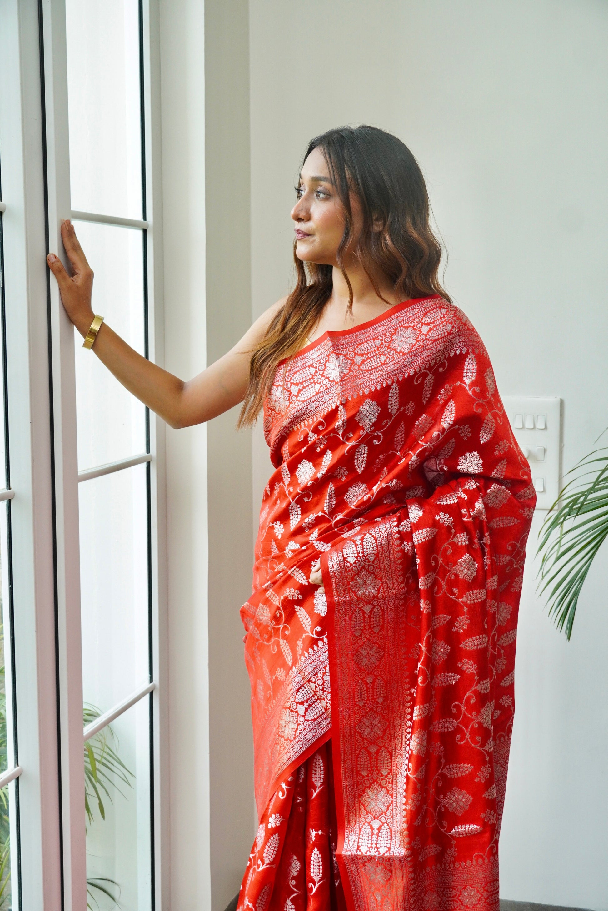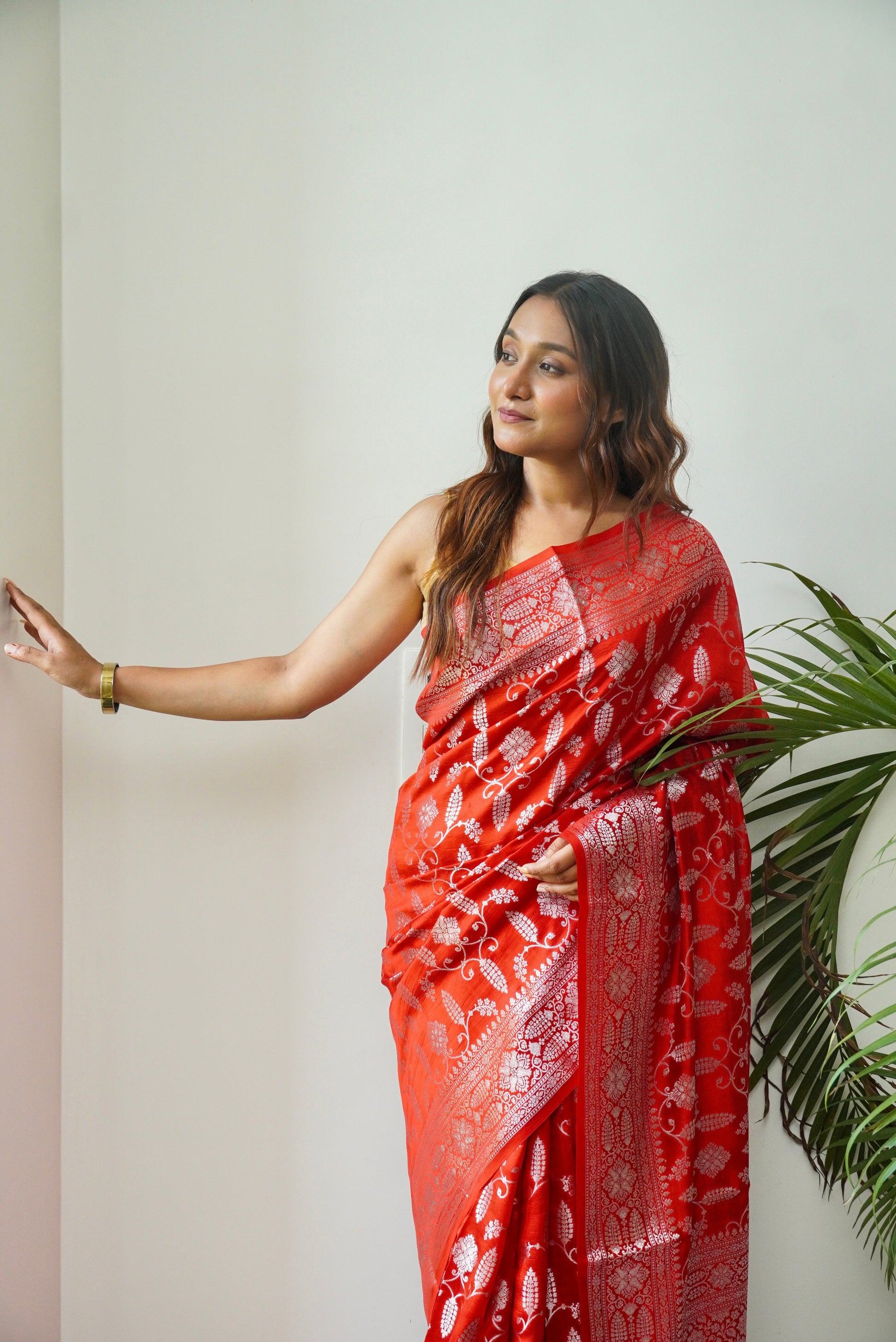 Elegant and radiant, this deep red Raw Mango silk saree exudes a timeless allure. Crafted with finesse, the rich red hue and intricate details seamlessly blend tradition and modernity, embodying grace and sophistication.