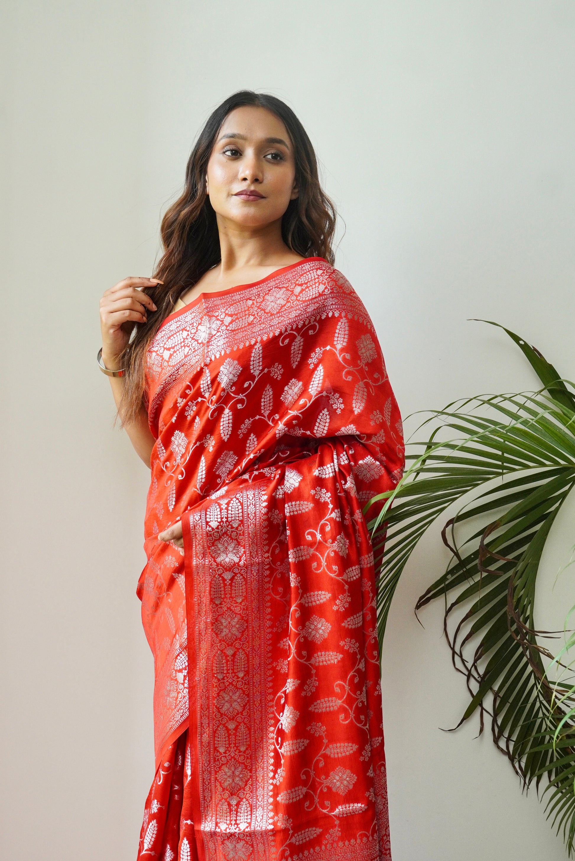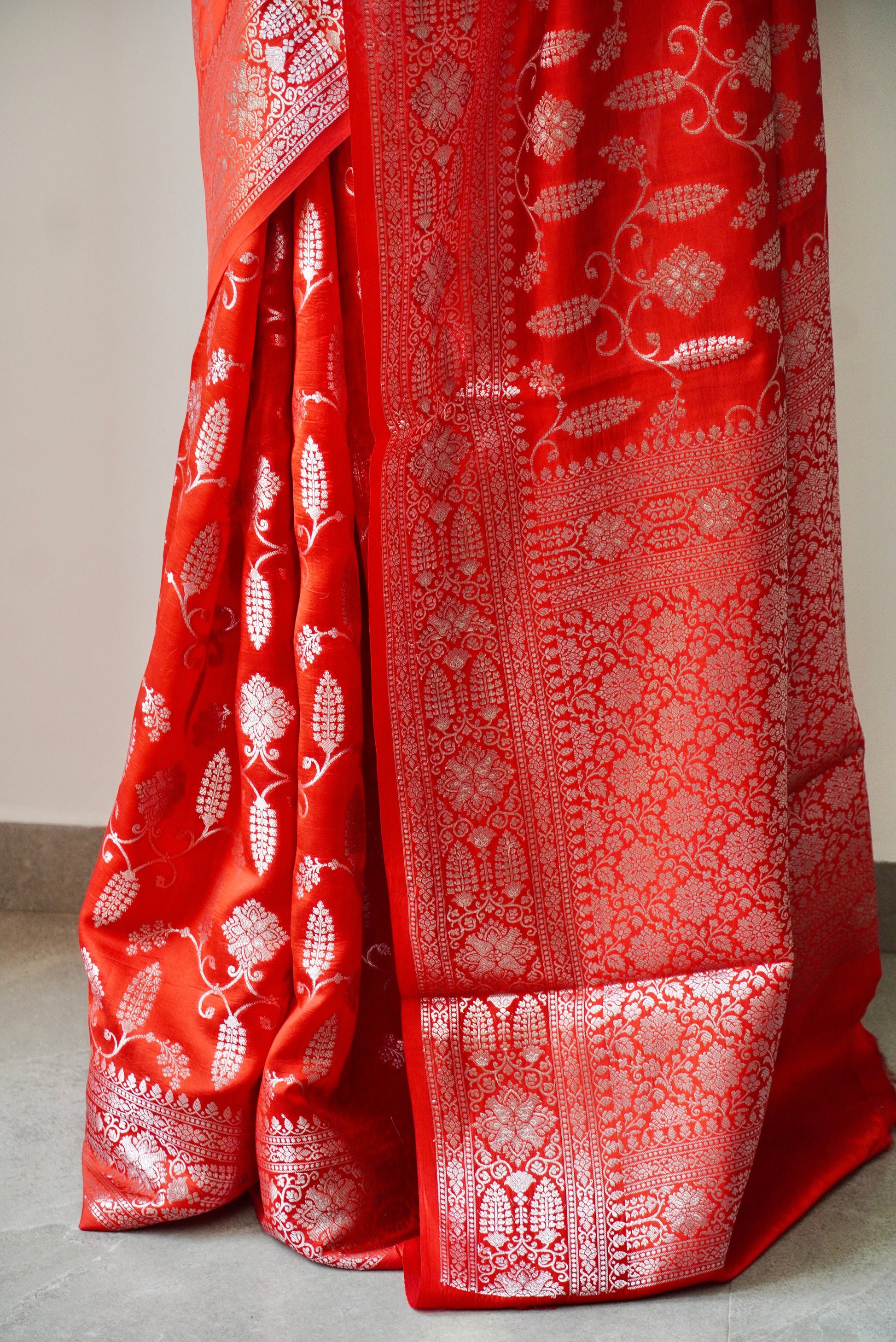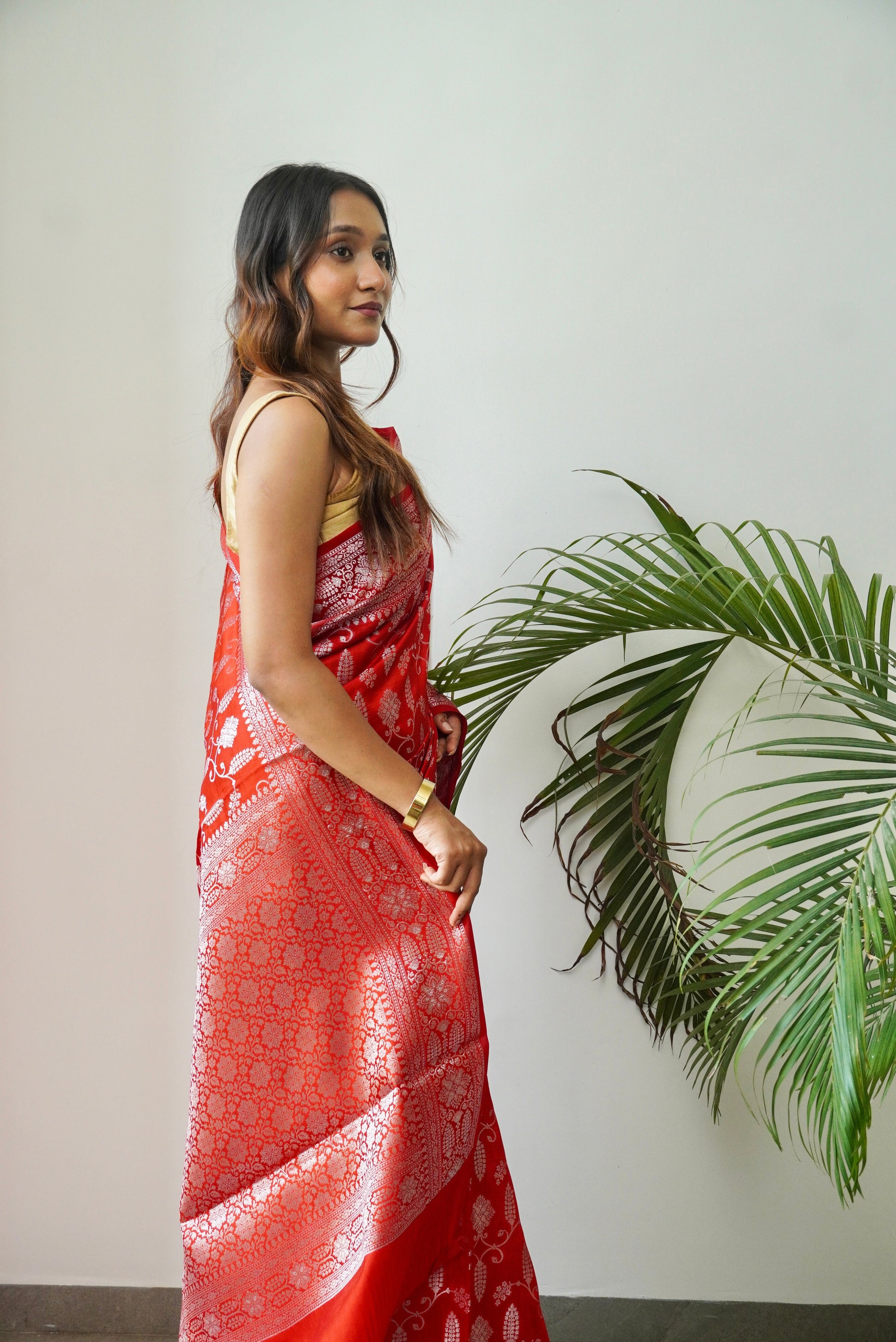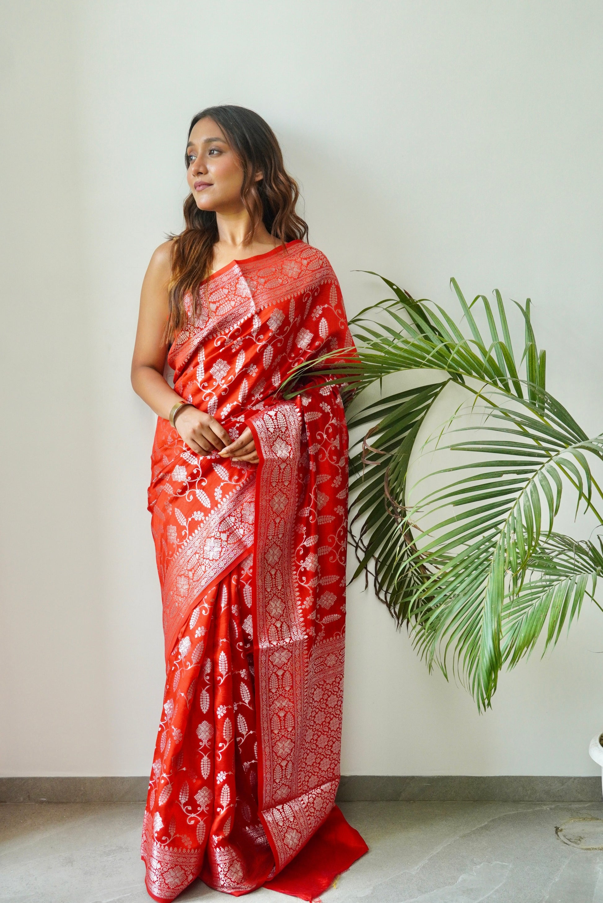 Elegant and radiant, this deep red Raw Mango silk saree exudes a timeless allure. Crafted with finesse, the rich red hue and intricate details seamlessly blend tradition and modernity, embodying grace and sophistication.