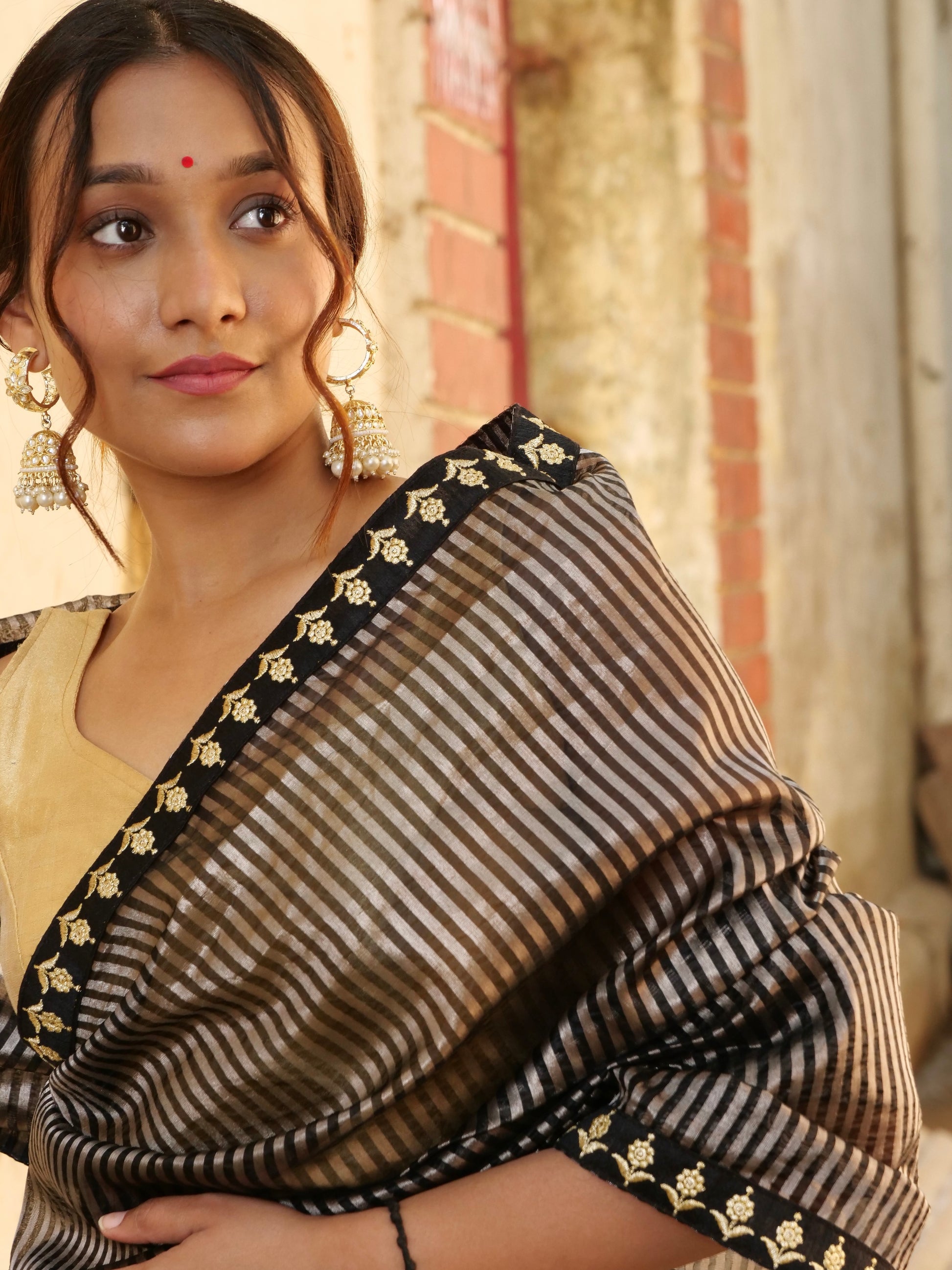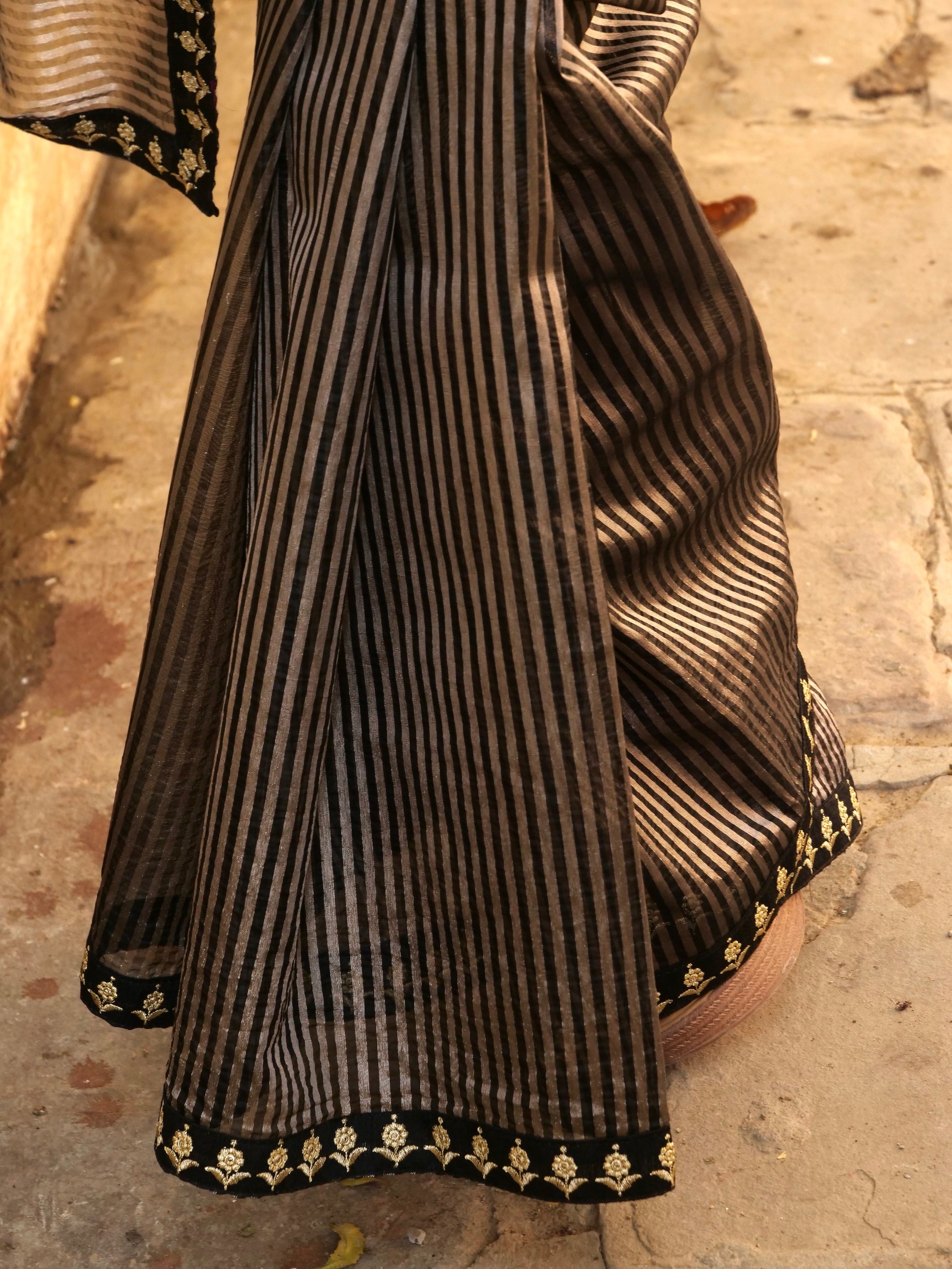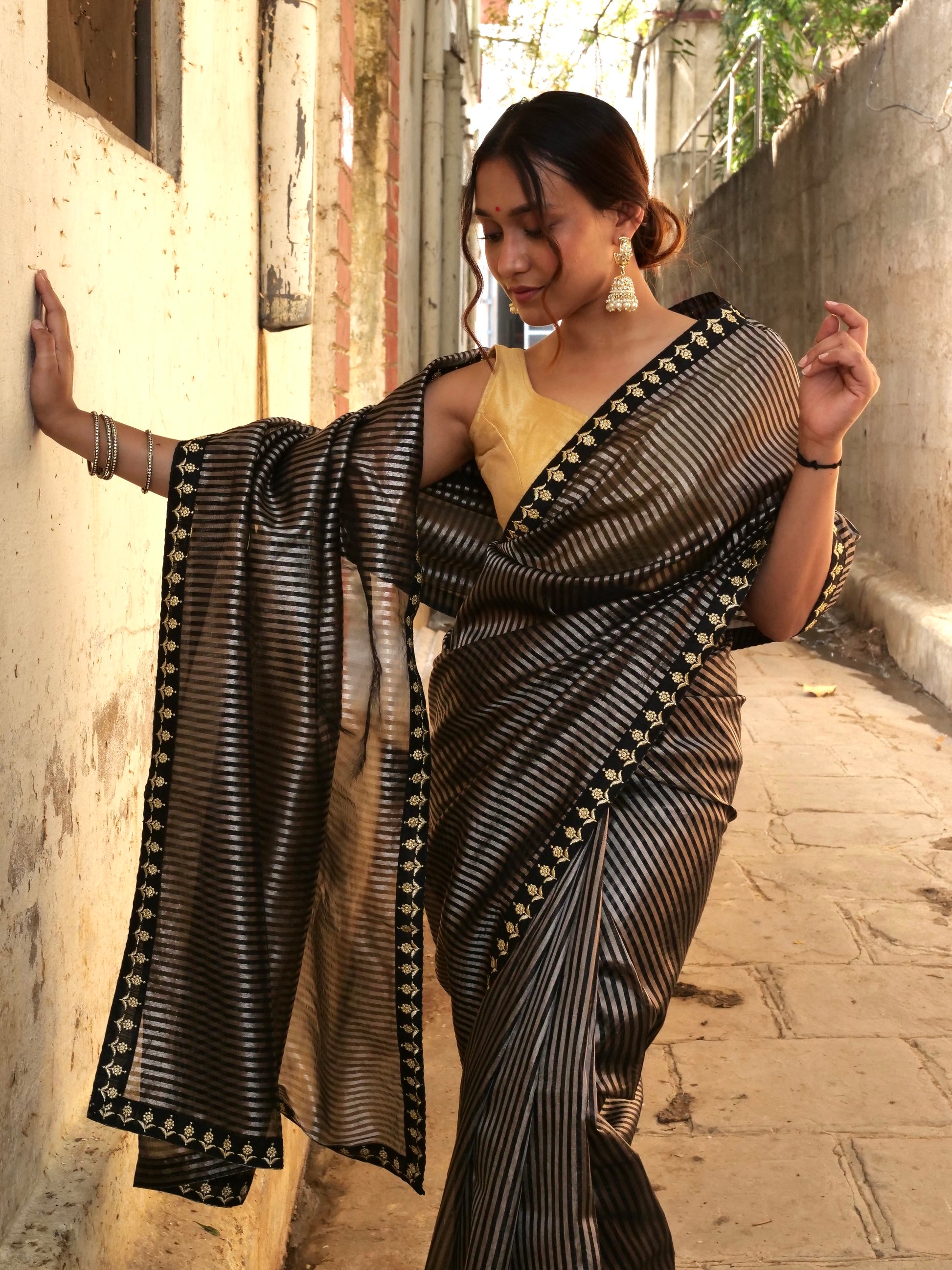 This tissue organza saree features striking vertical black and gold stripes, adding an element of timeless elegance to its design. The contrasting zari in gold colors create a sophisticated look, perfect for any occasion.