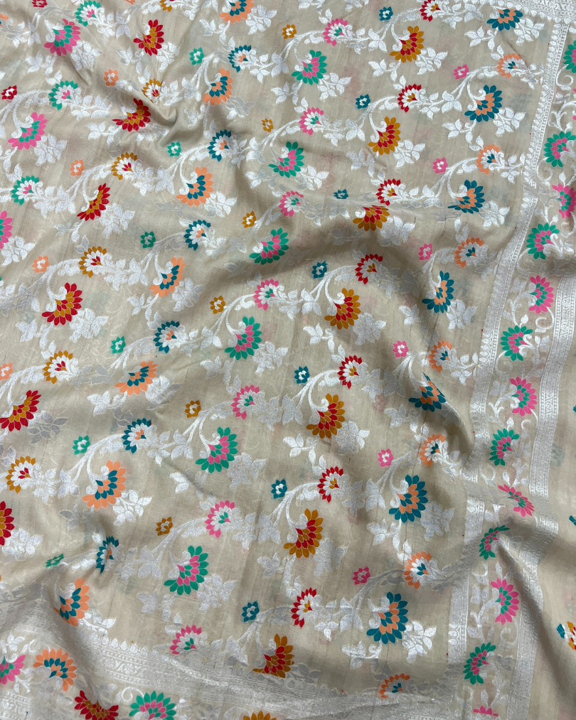 Embrace the elegance of Banarasi tradition with our Pure Tissue Tussar Georgette Tilfi Banarasi Saree, where intricate artistry meets timeless sophistication. This saree is filled with a stunning floral jaal pattern, showcasing meticulous handwoven Meenakari work across the body. The subtle ash-white base is beautifully complemented by the shimmering silver zari and a bold big butta border, enhancing the luxurious appeal of the saree. Ideal for weddings, festive celebrations, or evening events, the blend of fine craftsmanship and contemporary charm makes this saree a true showstopper.
