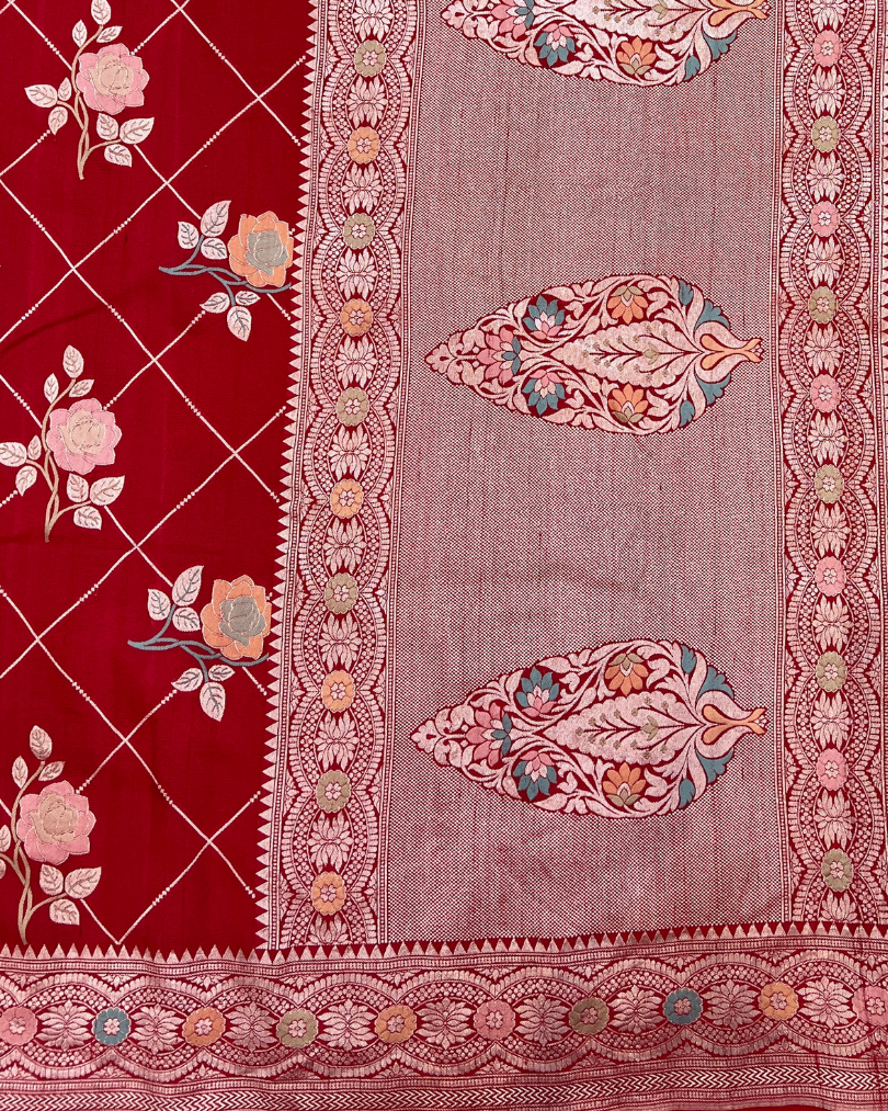 Specialty: Showcasing the masterful Kadhua weave, this saree features authentic handwoven Meenakari zari work with floral rose designs all around, embodying exceptional artistry and attention to detail.