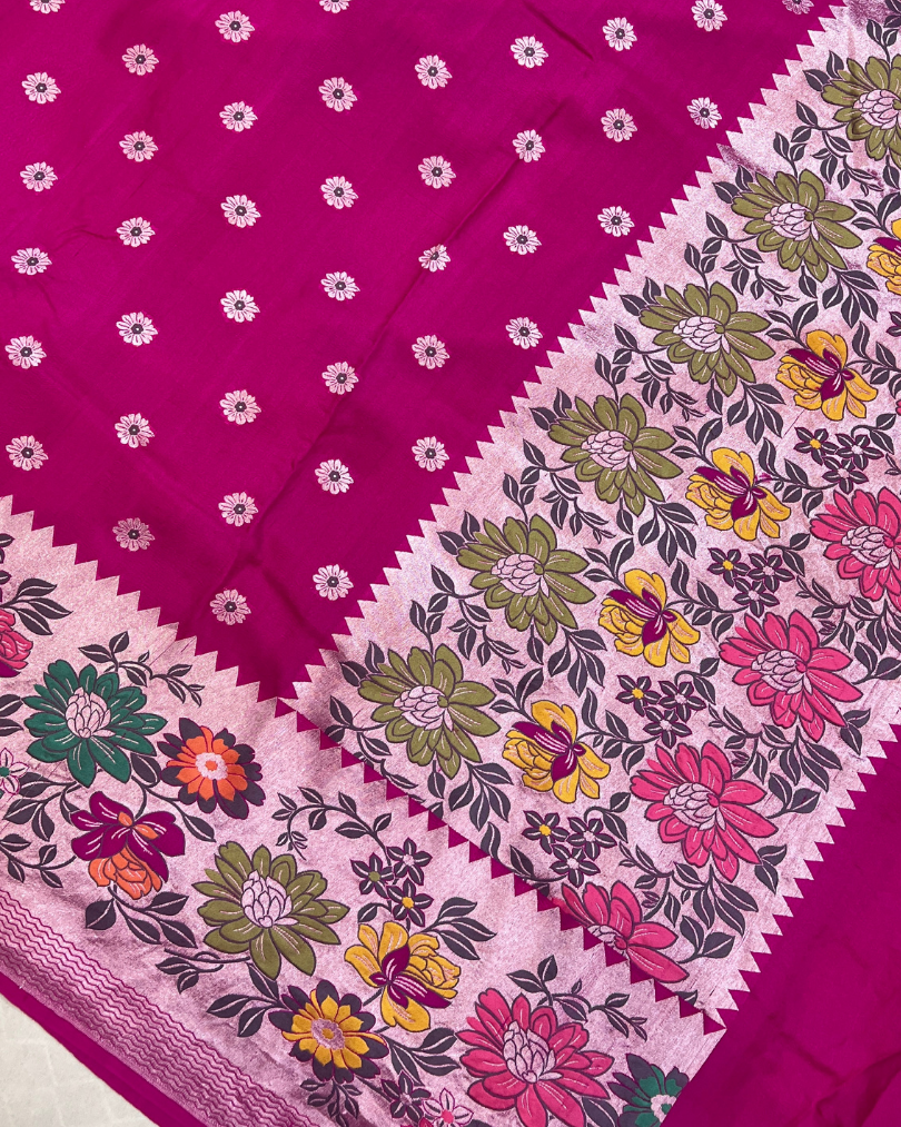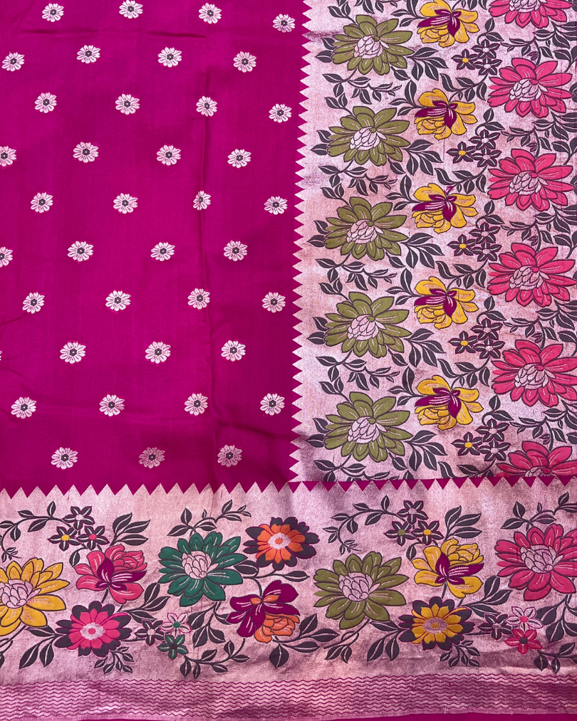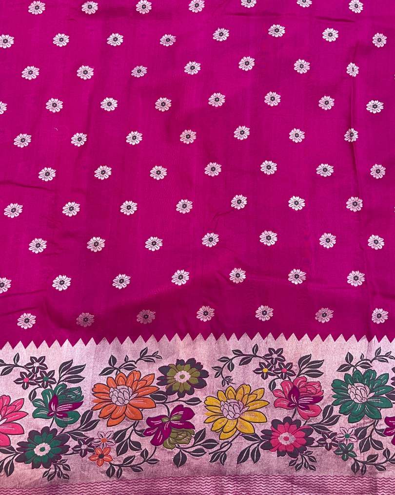 Infuse elegance into your wardrobe with our Pure Tussar Georgette Banarasi Saree in a refreshing Deep Pink, adorned with delicate small circles in silver zari throughout the saree and a bold, intricate floral border. This saree beautifully combines the subtle sheen of Tussar silk with the flowing drape of Georgette, creating a perfect blend of tradition and modernity.