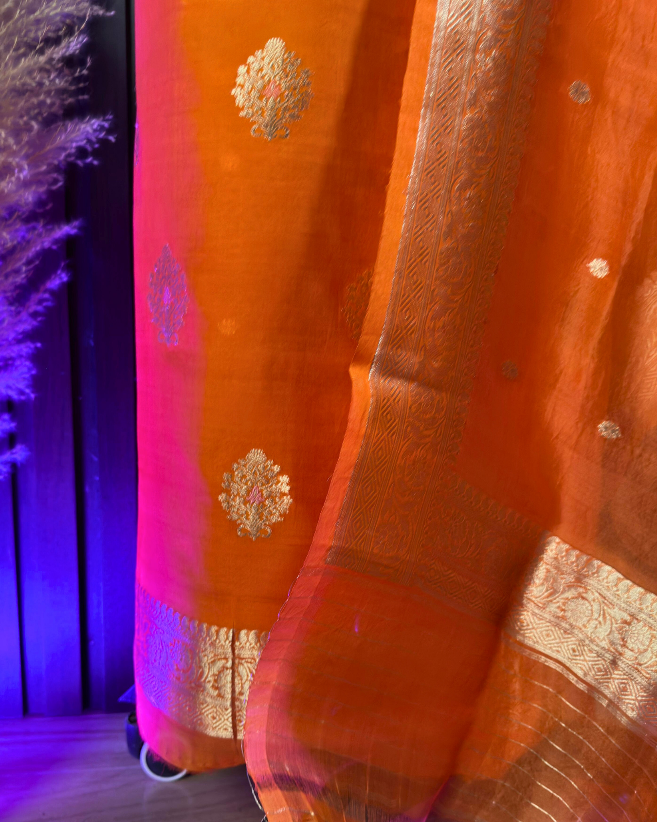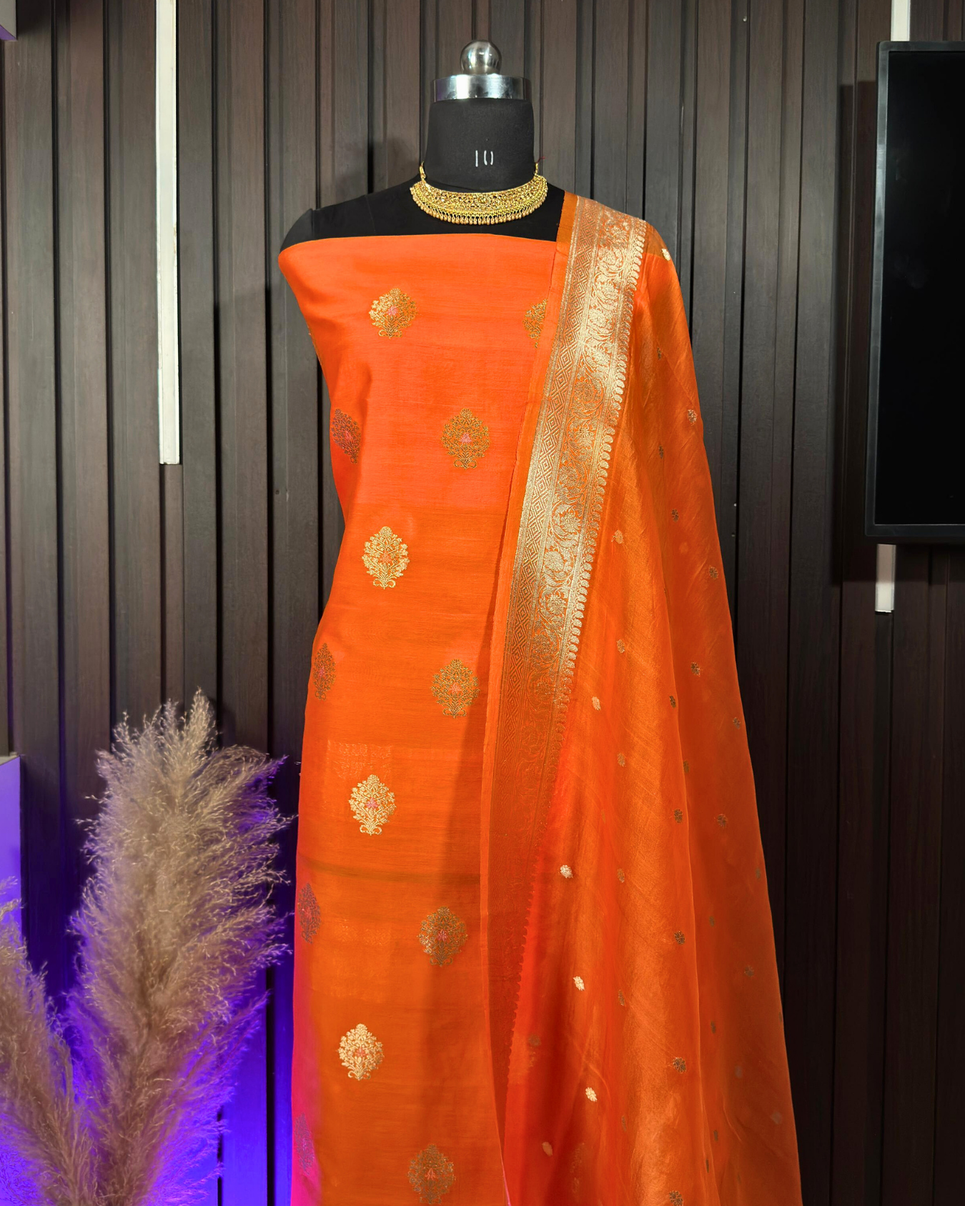 Orange Pure Banarasi Mercerised Kora Handloom Kadwa Suit Set with Dupatta