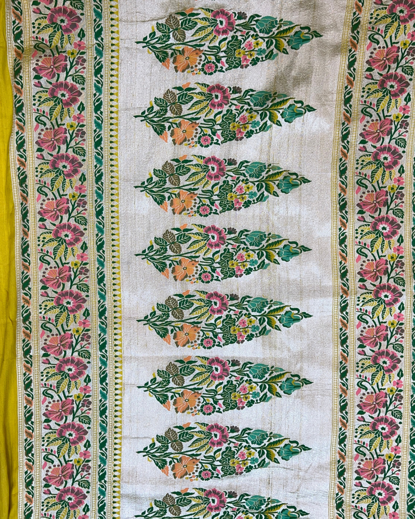 Specialty: Showcasing masterful Kadhua weave and authentic Meenakari work with silver leaves, meticulously handwoven, this saree highlights exceptional craftsmanship and attention to detail.